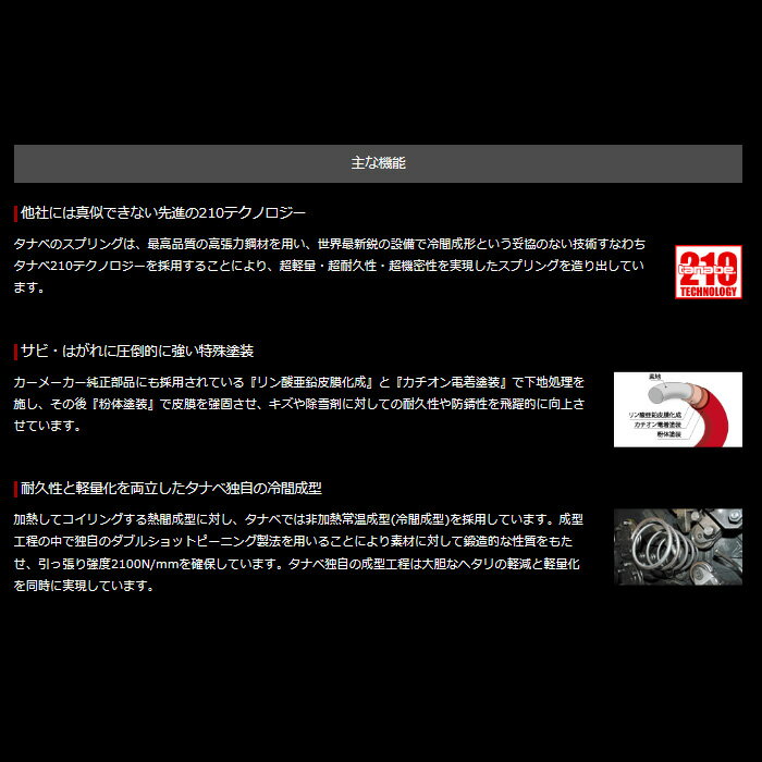 □適合車種車種名・ハスラー型式・MR52S年式・2020/1〜駆動・4WDその他適合条件1・ターボ車用□出品商品メーカー・タナベ商品名・DEVIDE UP210 アップサス品番・MR92S4WDUK出品個数・1台分□スプリング詳細推定アップ値(mm)・F:+20〜+30 / R:+15〜+25バネレート・F:2.1 / R:2.1車検について・車検対応(諸注意有)保証について・へたり永久保証(メーカー規定に準じます)その他1・ハイブリッドXターボでの車高確認データ□商品詳細tanabeアップスプリング[UP210]のご紹介です。ルックスはもちろん降雪路等での走破性も向上するリフトアップ。UP210は、注目のこのカスタムをスプリング交換だけで実践できるサステックの最新プロダクト。NF210ゆずりの快適な乗り心地。さらにロールセンターと車体重心点が近づくことから、ロールが減少し、コーナリングがスムーズになる効果もあります。タナベ独自のノウハウにより、車種ごとにベストなアップ値設計!車検対応、車高アップサスペンションです! 車高のアップ量は直前側方運転視界基準に準拠する範囲ですが、車両仕様や検査官判断などにより車検検査で不合格となる場合があります。この場合、ドアミラーなどに前方・側方視認できる補助ミラーなどで対応できる場合があります。(詳細は車検検査場及び軽自動車検査協会にてご確認ください。)メーカーオプションにてローダウン仕様のお車や車両個体差などもあります。この場合はカタログ表示値通りに上らない場合があります。ご注意ください。純正ショックを使用するため、車高が上ることで約1°〜1.5°ほどポジティブキャンバーになります。(逆ハの字)キャンバーボルトは必須とお考え下さい。※リアホーシングデフの車はデフ重量があるため、路面の段差などにより左右のバタつきが多くなることがあります。□送料[無料]こちらの商品は沖縄・離島への発送は行っておりません。(ご注文いただいた場合は、自動的にキャンセルとなります。)□代引きについて代引き手数料:[無料]□納期についてご注文後のメーカー取り寄せ手配となります。●メーカー在庫の有る場合●1-3営業日(土日祝除)で発送出来る予定です。▲メーカー在庫欠品の場合▲1-3ヶ月程度の納期がかかる場合が御座います。ご注文確認後にメールにて在庫状況と納期をお知らせいたします。欠品の場合は次回納期見込みをお知らせいたします。(欠品時のキャンセルは可能です)また、欠品の場合はやむをえずキャンセルさせていただく可能性があります。ご注文前にお問い合わせいただけましたら、その時点での納期見込みをお知らせいたします。お気軽にお問い合わせください。□注意事項■ご連絡について■ご連絡はメールとなります。2日以上経過してもメールが届かない場合はご連絡ください。■営業時間について■WEB営業時間は、10時〜17時です。(木曜定休)ご注文は24時間受け付けておりますが、16時以降のご注文やご質問は翌営業日のご連絡となる場合が御座います。■返品・交換・キャンセルについて■お客様都合による返品・交換・キャンセルはお受け出来ませんので、お間違いがないか今一度ご確認ください。■画像について■画像は代表画像を使用している場合が御座います。実際の商品と形状、見た目、構成部品が異なる場合が御座います。出品内容が優先されますのでご注意ください。その他ご不明点が御座いましたらお気軽にお問い合わせください。□保証について保証はメーカー規定に準じ、お買い上げ商品のみが対象です。保証期間中でも、商品不具合により発生した工賃や代車代等の費用はお客様ご負担となります。商品の欠陥や不良など当社原因による場合には、返品・交換を受け付けさせていただきます。こちらは初期不良対応となりますので、商品到着後、1週間以内にご連絡ください。機能部品等は、傷があっても動作に支障が無い場合は返品・交換の対象外となる場合が御座います。取り付け後はいかなる理由がありましても保証対象外となりますので、到着しましたら検品とご注文商品にお間違いが無いかご確認をお願いいたします。不具合、発送間違い、ご不明点等が御座いましたら、装着される前に必ずご連絡ください。