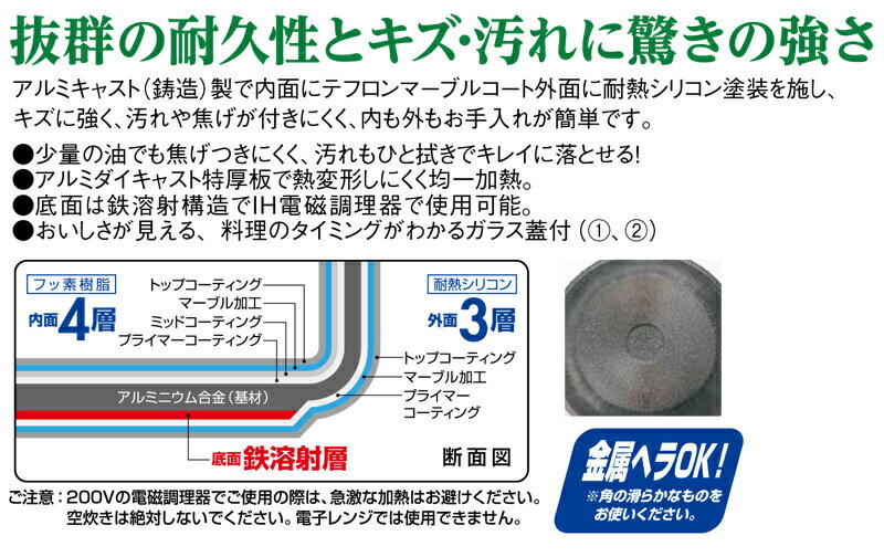 【外径】210mm×深さ44mm 【板厚】2.0mm 【底経】140mm 【底厚】3.5mm 【重量】0.61kg 抜群の耐久性とキズ・汚れに驚きの強さ アルミキャスト(鋳造)製で内面にテフロンマーブルコート外面に耐熱シリコン塗装を施し、キズに強く、汚れや焦げが付きにくく、内も外もお手入れが簡単です。 ・少量の油でも焦げつきにくく、汚れもひと拭きでキレイに落とせる! ・アルミダイキャスト特厚板で熱変形しにくく均一加熱。 ・底面は鉄溶射構造でIH電磁調理器で使用可能。 店舗用識別コード:TKG-77-0047-0301 TKG-77-0098-0301 TKG-78-0047-0301 TKG-78-0096-0301