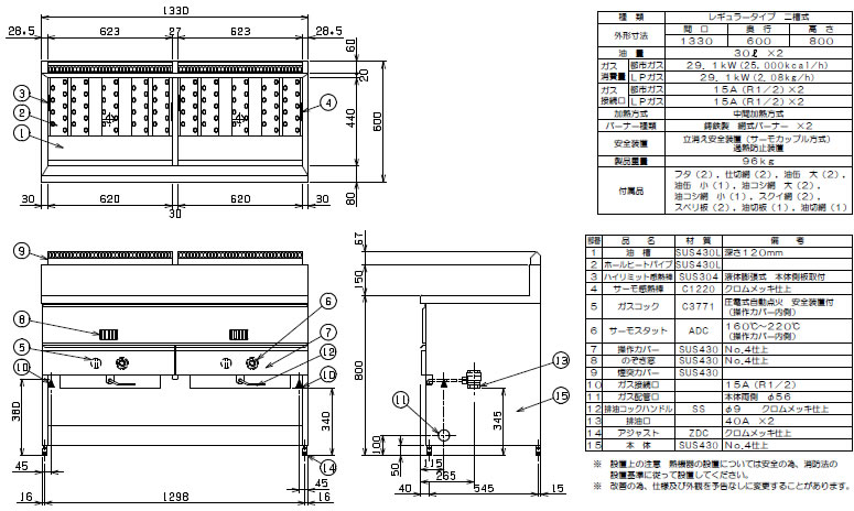 ※メーカー直送商品の為、代金引換には対応しておりません。 ※画像は同シリーズ商品です。 型番、サイズ、仕様をご確認の上ご注文下さい。 スタンダードシリーズ お店の規模、メニューに合わせて選べる豊富な品数。 ・従来の中間加熱方式にマルゼン独自の循環パイプをプラス。 これにより油の循環速度が速くなり、伝熱面積を一気に50%も広くし、熱効率が一段と向上しました。 ・油温の急速加熱ができるので、ピーク時でもお客さまを待たせることなく、スピード調理ができます。 ・油の酸化が少なく、いつも新鮮でおいしく提供できます。 【外形寸法】間口1330×奥行600×高さ800×バック150mm 【油量】30L×2 【ガス消費量】都市ガス29.1kW 25000kcal/h、LPガス29.1kW 2.08kg/h 【ガス接続口】都市ガス 15A×2、LPガス 15A×2 【備考】二槽式 ■■■■配送についての注意■■■■■ ・運送業者の運転手さんは原則1人の為、中型、大型商品の荷下ろしが出来ませんので、 配達当日は荷下ろしできるように、 人手をご用意下さい。 ・3~4人で持ち運ぶ事が困難な重量物の商品は支店止めとなります。 支店止めの場合はご足労ですが、お近くの営業所までお引き取りに行って頂く形になります。 #recommend#