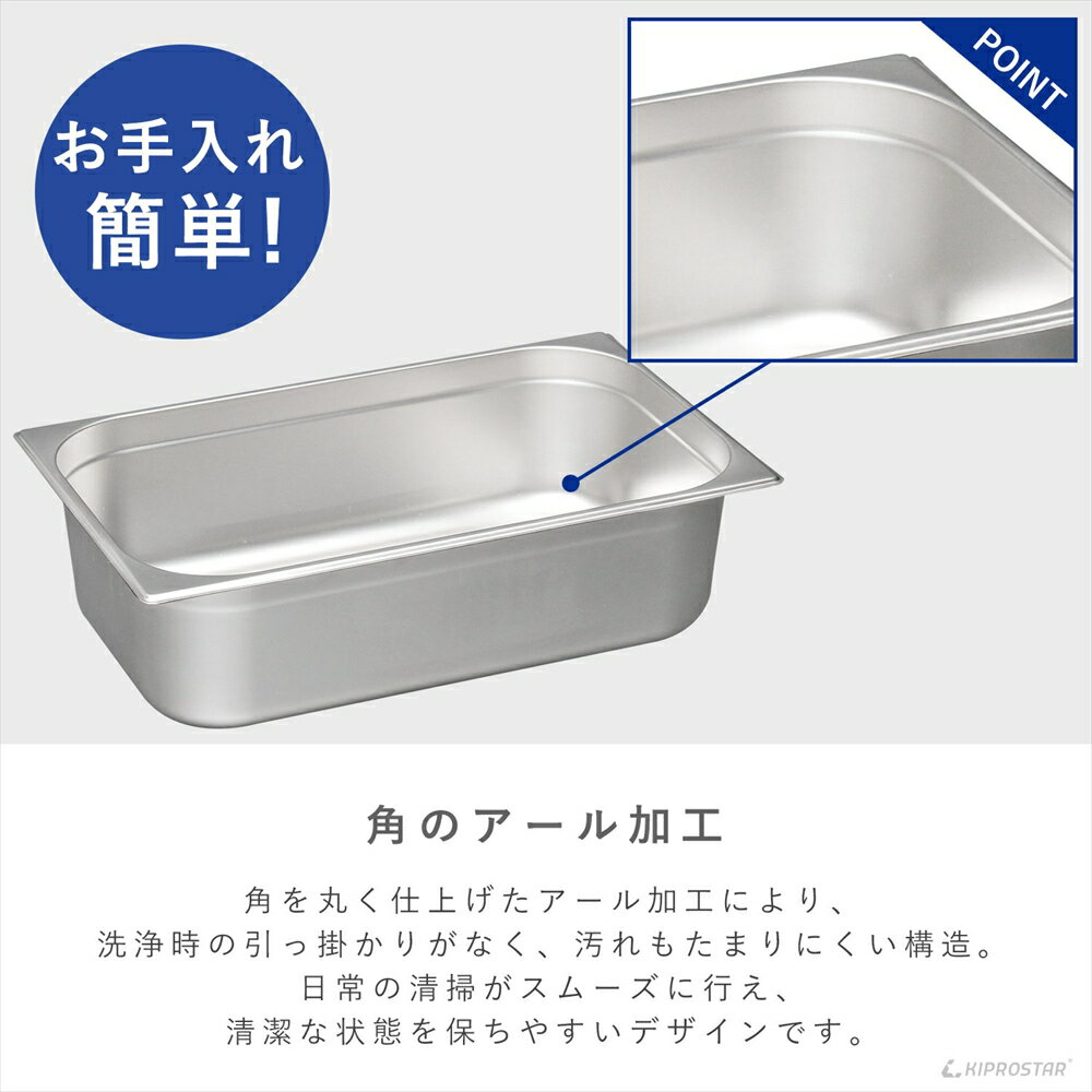 KIPROSTAR フードウォーマー PRO-SIF,PRO-WIF 標準付属のホテルパンです。 汎用のホテルパンとしてもご使用頂けます。本体と蓋のセットです。 角はアール加工で洗いやすく、汚れが残りにくい設計。表面にはEP処理を施し、光沢が美しく汚れや菌も付きにくい仕上がりです。 さらに巻きフチをなくすことで隙間に汚れが溜まらず、HACCP対応で衛生管理も安心。清潔さを追求したプロ仕様のホテルパンです。 【材質】ステンレス 【深さ】150mm 【容量】約9.0L(※満水時の容量です) ※商品仕様は随時改善されており、入荷時期により多少のデザイン変更が行われる場合がございます。