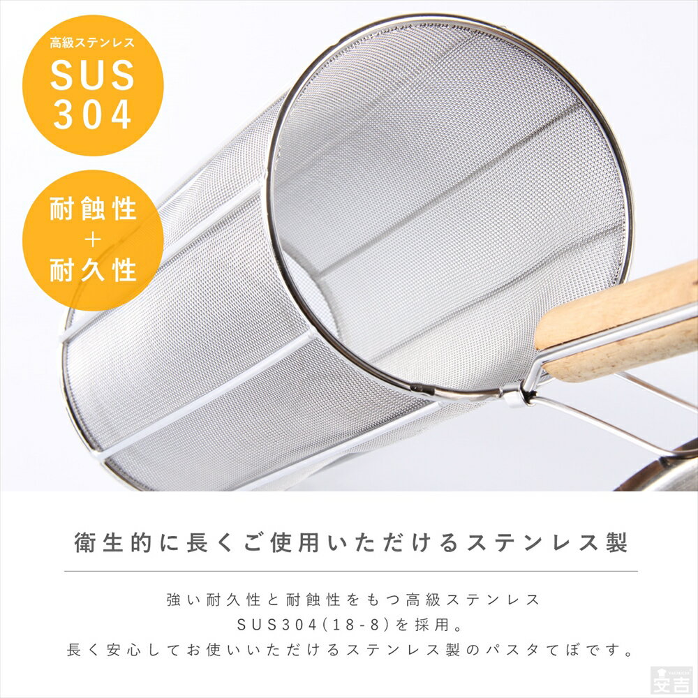 【商品名】ステンレス スパゲティてぼ 30cm(20メッシュ) 【サイズ】約φ125mm 深さ297mm 柄の長さ175mm 【材質】18-8ステンレス/柄:木 ●使用上の注意 湯切りする際はてぼをぶつけて振らないでください。 ステンレスは「錆びにくい」金属ではございますものの、 酸化皮膜が破壊された場合には錆が生じます。 ・醤油や味噌など塩分のある調味料が付着したまま放置する ・漂白剤、塩素系クレンザーの使用 これらの行為は錆びの原因となります。 特にパスタをゆでる塩水が付着したままの放置は錆びやすい為、 ご使用後は汚れをよく洗い落とした後、しっかりとすすぎ、乾燥させてください。 ●特長 20メッシュの極細目で細い麺にも対応しております。 スパゲッティやフィットチーネに代表されるロングパスタの他、マカロニやペンネ、シェルといったショートパスタにも最適です。 テボのザル部は2サイズのご用意がございます。麺の長さによりお選びください。 SUS304ステンレスを採用しているので腐食にも強く衛生的です。 パスタ以外のおそばやラーメン、うどんといった麺類の揚げざるとしてもご使用が可能です。 他にも、スリースノーやパワーてぼ、フジボシ製などの他メーカー製てぼも取り扱いがございます。 メッシュ数やパンチング、形状など様々な商品がございますので一度ご閲覧くださいませ。・使用しているステンレス寸胴鍋はこちら 関連商品