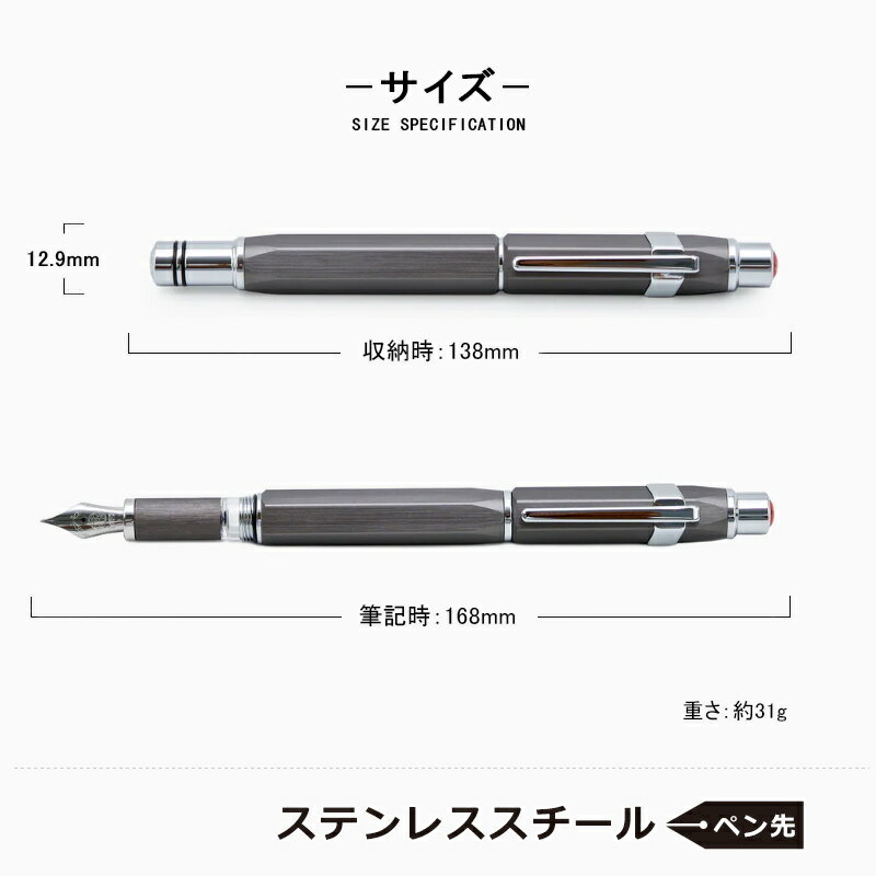 【ブランド】 ツイスビー TWSBI 【品 名】 プレシジョン Precision 特別生産品 【仕 様】 吸入式万年筆 ペン先素材:ステンレススチール 文字幅:EF 極細字/F 細字 長さ:約138mm(収納時)/約168mm(筆記時) 最大軸径:約12.9mmφ(クリップを除く) 重さ:約31g 【機 構】 吸入式 【付 属 品】 ツイスビーゴー専用箱、分解キット(ミニレンチ×1、ミニグリス×1) 【消 耗 品(別売り)】 ツイスビー ボトルインク 【商品説明】 六角形ボディの万年筆『プレシジョン』 シャープペンシルやボールペンでお馴染みのプレシジョンシリーズの万年筆。六角形の金属ボディはTWSBIの中でも新感覚の万年筆となっています。 インク吸入方法は、安定の本体吸入式。インクをたっぷり入れることができます。 ギフト プレゼント 母の日 父の日 敬老の日 誕生日 成人の日 ブライダル バレンタインデー ホワイトデー クリスマス 記念日 お中元 お歳暮 正月 先生 学生 上司 就職 栄転 送別 転勤 定年 退職 送別会 結婚祝い 内祝い 出産祝い 入園 入学 合格 卒園 卒業 昇進 開店 開業 新築 引っ越し 長寿 還暦 古希 高級 人気 万年筆 ボールペン シャーペン 筆記具 ライター パイプ 煙管 喫煙具 システム手帳 ペンケース カレンダー マフラー ネクタイピン 財布 ベルト 名入れ ラッピング のし YouStyle ユースタイル