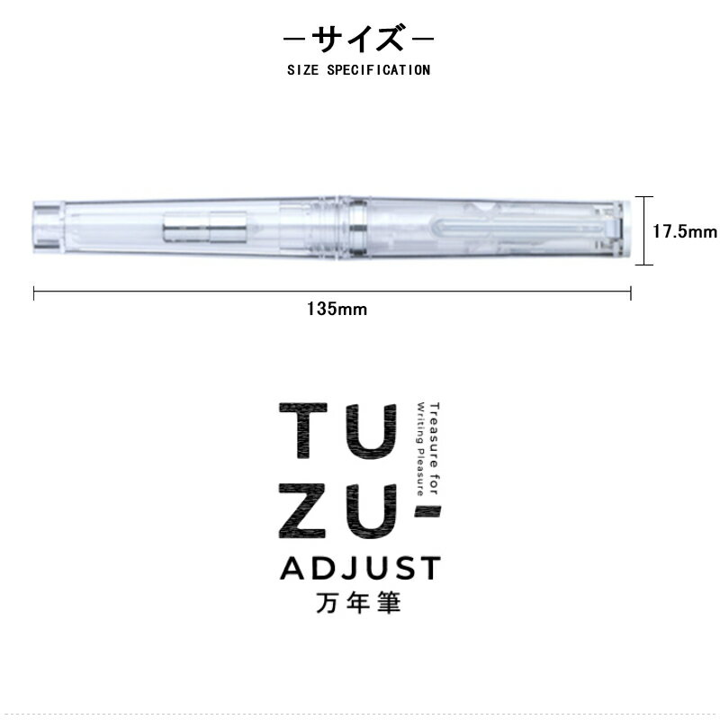 【ブランド】 セーラー SAILOR 【品 名】 TUZU アジャスト 万年筆 グラッシー 【仕 様】 クリスタルホワイト:12-0561-201/12-0561-401/12-0561-601 クリスタルチェリー:12-0561-202/12-0561-402/12-0561-602 クリスタルスカイ:12-0561-203/12-0561-403/12-0561-603 ペン先:ステンレス 蓋・胴・クリップ:再生PC樹脂 大先:ABS樹脂 金属部品:ニッケルクロムメッキ仕上げ 【サ イ ズ】 φ17.5×135mm(クリップ部含む) 万年筆:重さ約20.0g 【機 構】 両用式(コンバーター付 属 ・カートリッジ) クリアカラーになじむナチュラルを搭載 【付 属 品】 メーカー純正ケース・説明書・コンバーター内蔵 【消 耗 品(別売り)】 コンバーター:14-0506(全10色) カートリッジインク:13-0604(極黒・青墨・蒼墨) ボトルインク:13-9257(全12色) 【商品説明】 一昔前のカルチャーに新しいエッセンスを加えてリバイバルするプロダクト。その感性を透明素材に託した、レトロモダンな質感をまとう万年筆です。 昭和から続くコーラ瓶、かき氷(ガラス器や氷コップ)、今ブームのレジンアクセサリー等が持つ透明素材と同様に中が見える安心感、スケ感がプロダクトに軽快感とカジュアル感を与えます。 以前から透明の万年筆はデモンストレーターと言われ、一定のユーザー数を確保していました。今回のシリーズでは透明にクリスタルカラーモデルを加え、デモンストレーターユーザーの規模の拡大を目指します。 ギフト プレゼント 母の日 父の日 敬老の日 誕生日 成人の日 ブライダル バレンタインデー ホワイトデー クリスマス 記念日 お中元 お歳暮 正月 先生 学生 上司 就職 栄転 送別 転勤 定年 退職 送別会 結婚祝い 内祝い 出産祝い 入園 入学 合格 卒園 卒業 昇進 開店 開業 新築 引っ越し 長寿 還暦 古希 高級 人気 万年筆 ボールペン シャーペン 筆記具 ライター パイプ 煙管 喫煙具 システム手帳 ペンケース カレンダー マフラー ネクタイピン 財布 ベルト 名入れ ラッピング のしYouStyle ユースタイル