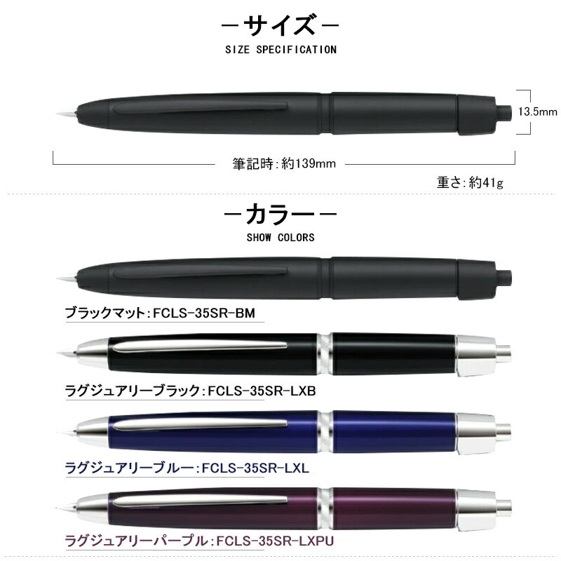 【ブランド】 パイロット PILOT 【品 名】 キャップレスLS 【仕 様】 ノック&ツイスト式万年筆 軸:アルミ・塗装(LXB・LXL・LXPU)、アルミ・黒クロム仕上(BM) ヘッド:ステンレス・ロジウム仕上(LXB・LXL・LXPU) 、黒クロム仕上(BM) クリップ:鉄鋼・ロジウム仕上(LXB・LXL・LXPU)、黒クロム仕上(BM) ペン先:18K ロジウム仕上 文字幅:F細字/M中字 長さ:約145mm(収納時)/約139mm(筆記時) 最大胴軸径:約13.5mmφ(クリップを除く) 重さ:約41g 【カ ラ ー】 ブラックマット:FCLS-35SR-BM ラグジュアリーブラック:FCLS-35SR-LXB ラグジュアリーブルー:FCLS-35SR-LXL ラグジュアリーパープル:FCLS-35SR-LXPU 【機 構】 両用式/コンバーター(別売)・カートリッジインク 【付 属 品】 メーカー純正ケース・説明書・カートリッジインク 【消 耗 品(別売り)】 コンバーター:CON-40/CON-70N ボトルインク:BT70(70ml) / INK-30(30ml) カートリッジイ ン ク:IRF-5S(5本入)/IRF-12S(12本入) 【商品説明】 世界初、キャップのない万年筆として、1963年の発売以来、半世紀以上に及ぶロングセラー万年筆「キャップレス」。ノック式ボールペンのようにワンノックですばやく書くことができ、ペン先収納時は気密性の高いシャッター機構でインキの乾燥を防ぎます。 ギフト プレゼント 母の日 父の日 敬老の日 誕生日 成人の日 ブライダル バレンタインデー ホワイトデー クリスマス 記念日 お中元 お歳暮 正月 先生 学生 上司 就職 栄転 送別 転勤 定年 退職 送別会 結婚祝い 内祝い 出産祝い 入園 入学 合格 卒園 卒業 昇進 開店 開業 新築 引っ越し 長寿 還暦 古希 高級 人気 万年筆 ボールペン シャーペン 筆記具 ライター パイプ 煙管 喫煙具 システム手帳 ペンケース カレンダー マフラー ネクタイピン 財布 ベルト 名入れ ラッピング のしYouStyle ユースタイル