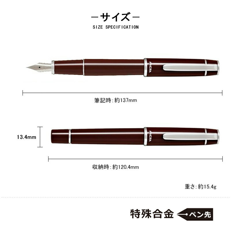 【ブランド】 パイロット PILOT 【品 名】 プレラ PRERA 【仕 様】 キャップ式万年筆 軸/キャップ:樹脂製 ペン先:特殊合金 F細字/M中字/CM(カリグラフィ) 長さ:約120.4mm(収納時)/約137mm(筆記時) 最大胴軸径:約12mmφ キャップ径:約13.4mmφ(クリップを除く) 重さ:約15.4g 【カ ラ ー】 ダークターコイズ:P-FPR-1-DTQ オフホワイト:P-FPR-1-OW レッドブラウン:P-FPR-1-RBN イエロー:P-FPR-1-WY ■色彩逢い(いろあい) 透明ブラック:P-FPR-1-TB 透明ブルー:P-FPR-1-TL 透明ライトブルー:P-FPR-1-TLB 透明ライトグリーン:P-FPR-1-TLG 透明オレンジ:P-FPR-1-TO 透明ピンク:P-FPR-1-TP 透明レッド:P-FPR-1-TR 【機 構】 両用式/コンバーター(付属)・カートリッジインク 【付 属 品】 ・メーカー純正ケース ・説明書 ・カートリッジインク(ブラック)1本 ・コンバーター 【消 耗 品(別売り)】 ボトルインク:BT70(70ml)/INK-30(30ml) ボトルインク:色彩雫 INK-15/INK-50 カートリッジインク:IRF-5S(5本入) /IRF-12S(12本入) コンバーター:CON-40(CV-40) 【商品説明】 ■プレラ 持ち運びに便利なショートサイズの万年筆『プレラ』 「万年筆と過ごす丁寧な時間。」をテーマに、「クラシカルな喫茶店に置かれたヴィンテージインテリア」をイメージしたカラー4色展開。 専用コンバーターを装着しているので、お好みのインキの色を入れてお楽しみいただけます。 ■プレラ 色彩逢い(いろあい) カジュアルな装いで、気軽に使えるスケルトンボディの万年筆 インキの供給には、専用コンバーターを装着。 パイロットの万年筆用インキ「色彩(いろ)雫(しずく)」(全24色)を用いれば、お好みの色で筆記できるだけでなく、透明なボディを通してインキ色を楽しむことができます。 ギフト プレゼント 母の日 父の日 敬老の日 誕生日 成人の日 ブライダル バレンタインデー ホワイトデー クリスマス 記念日 お中元 お歳暮 正月 先生 学生 上司 就職 栄転 送別 転勤 定年 退職 送別会 結婚祝い 内祝い 出産祝い 入園 入学 合格 卒園 卒業 昇進 開店 開業 新築 引っ越し 長寿 還暦 古希 高級 人気 万年筆 ボールペン シャーペン 筆記具 ライター パイプ 煙管 喫煙具 システム手帳 ペンケース カレンダー マフラー ネクタイピン 財布 ベルト 名入れ ラッピング のしYouStyle ユースタイル
