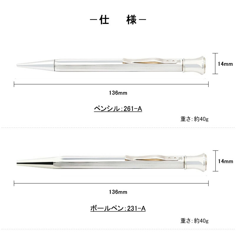 【ブランド】 アウロラ AURORA 【品 名】 パーマネント PERMANENTO 【仕 様】 素材:スターリングシルバー925(純銀) 長さ:約136mm 軸径:約14φ 重さ:約40g ・ツイスト式シャープペンシル ペンシル:261-A 初期装填:ペンシル替え芯:0.9mm ・ツイスト式ボールペン ボールペン:231-A 初期装填:ブラック 0.7mm/M中字 【付 属 品】 メーカー純正ケース・説明書兼保証書 【産 地】 イタリア 【消 耗 品(別売り)】 ボールペン替え芯:132(黒/青) 【商品説明】 スターリングシルバー925を使用し、ハンドメイドでイタリア職人が丁寧に仕上げした芸術品と言っても過言ではないシャープペンシル/ボールペンです。貴金属いつまでも変わることのない価値と性質は、人々を魅了する宝飾品としてだけでなく、身近な家電製品から、最先端技術が要求されるハイテク産業まで、生活に必要不可欠な金属材料として重要な資源です。 したがって、製品に対する消費者の目も厳しく、高度な品質と、適切な価格が要求されます。 その証しとしてのホールマーク(純分検証刻印)は、大変厳格な基準に基づいて打刻されています。 伝統的な職人芸と最新の技術の粋を集約させた、アウロラのお薦めです。 ギフト プレゼント 母の日 父の日 敬老の日 誕生日 成人の日 ブライダル バレンタインデー ホワイトデー クリスマス 記念日 お中元 お歳暮 正月 先生 学生 上司 就職 栄転 送別 転勤 定年 退職 送別会 結婚祝い 内祝い 出産祝い 入園 入学 合格 卒園 卒業 昇進 開店 開業 新築 引っ越し 長寿 還暦 古希 高級 人気 万年筆 ボールペン シャーペン 筆記具 ライター パイプ 煙管 喫煙具 システム手帳 ペンケース カレンダー マフラー ネクタイピン 財布 ベルト 名入れ ラッピング のし YouStyle ユースタイル