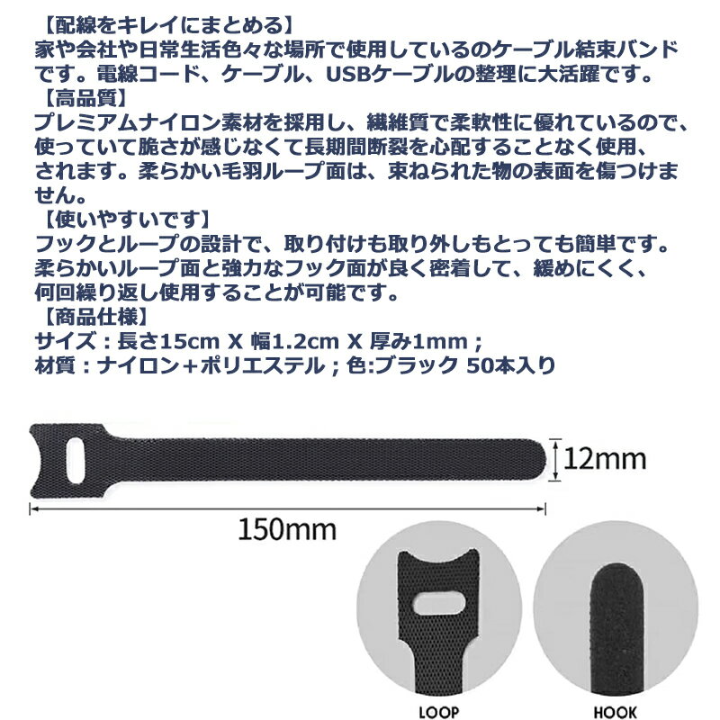 【50本】 ケーブルバンド ケーブル結束バンド 面ファスナー ナイロン製 収納バンド コード配線収納 ケーブル束ねる 収納 束ねる 繰り返し利用可能 12mm×15cm 黒 白