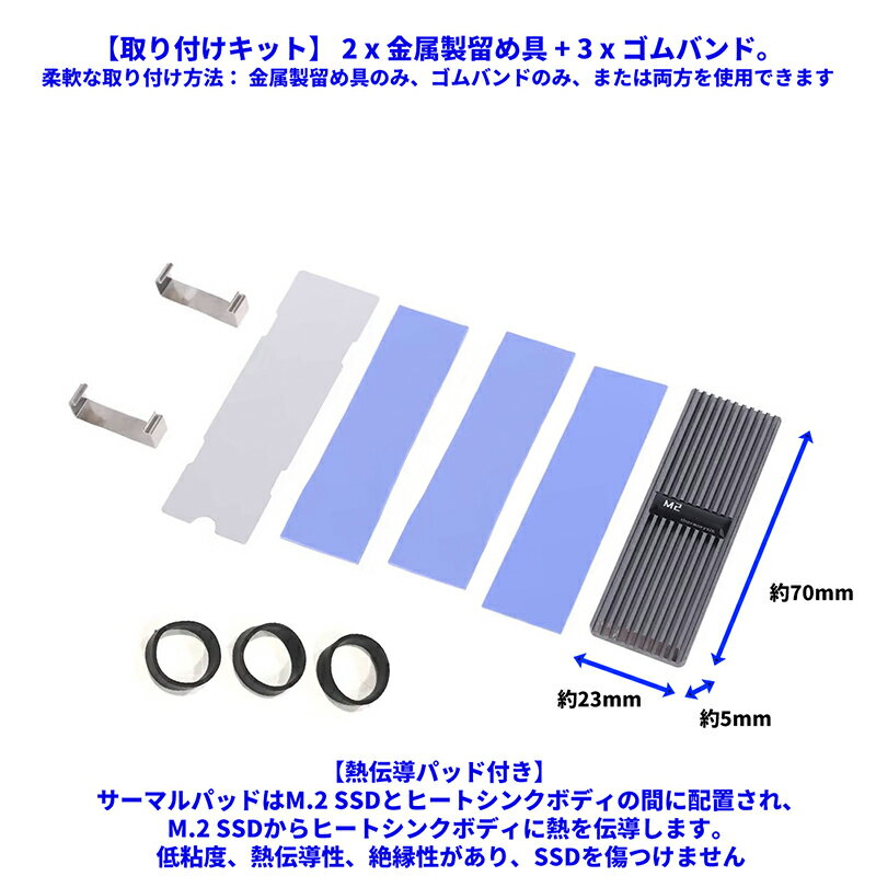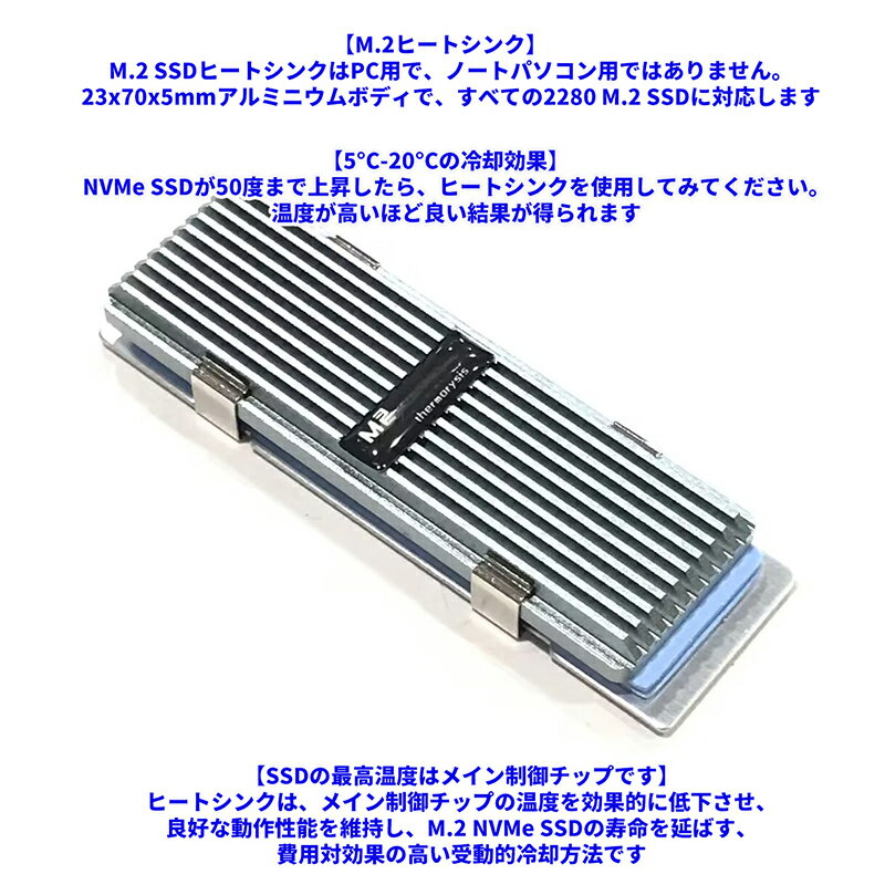 【2個】 M.2 ヒートシンク(2280 M.2 SSDに適合)、PCをインストール、23x70x5mmアルミニウム製全体、導熱接着シート付き