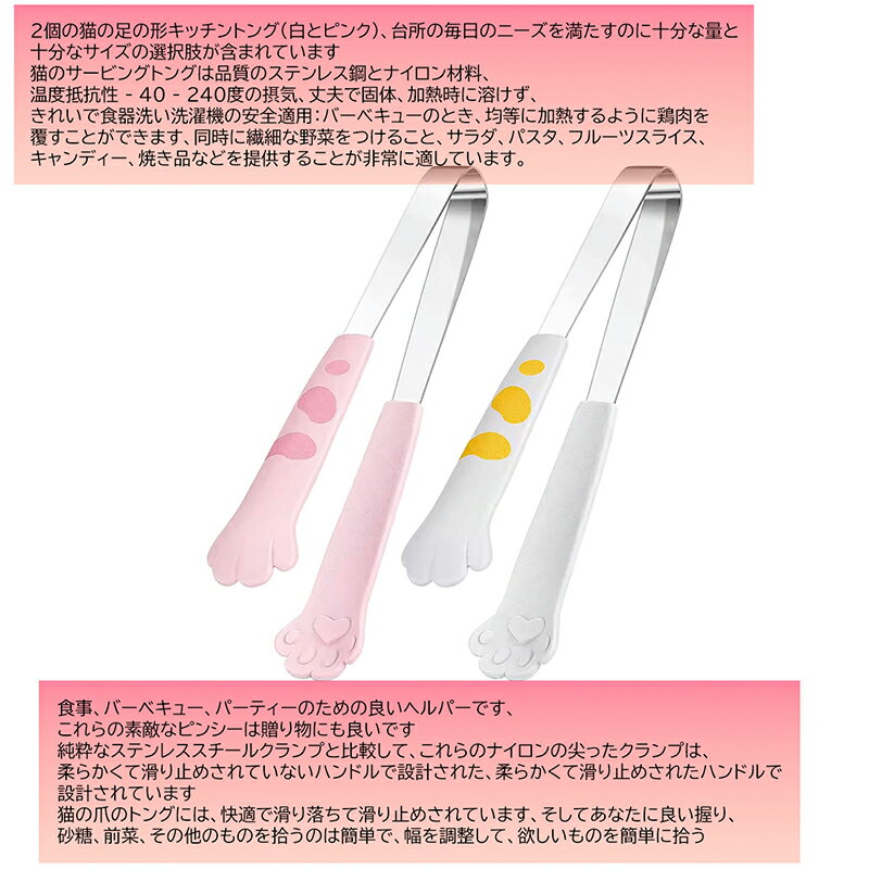 【計2個】 食品トング 猫の足 調理トング 耐熱 可愛い グステンレスバーベキュートング ピンク 白 各1個