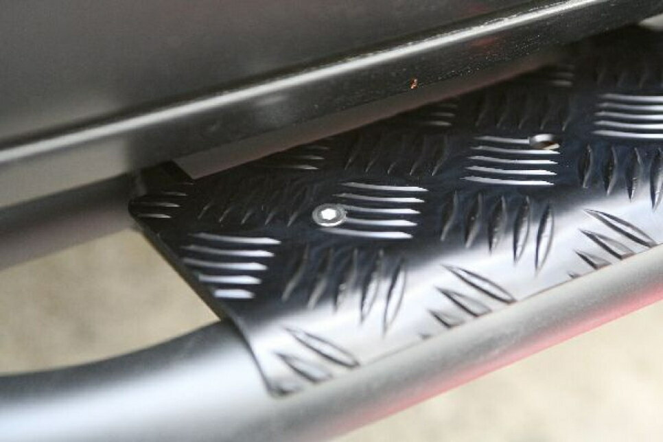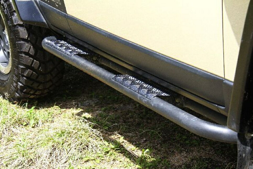 車メーカーTOYOTA車種FJクルーザー型式GSJ15W品名サイドシルガード&ステップ(FJクルーザー)備考納期はご確認ください注意事項※ お客様の見落としや確認ミスでのキャンセル・交換・返品は一切お受けできません。※ 商品画像は代表車種の物です。車種毎に形状は異なります。※ 適合情報は随時更新しておりますが、告知なくメーカー側にて更新される場合がございますので、必ずご注文前にメーカー適合表にて最新の適合表をご確認頂ますようお願い致します。納期についてメーカー在庫があれば3~4日営業日、欠品時は1ヶ月~お時間がかかります。お急ぎの場合はご注文前に必ず在庫確認をお願い致します。※納期が遅い等によるキャンセルは一切お受けできません。有限会社モトレージ Motorage Limited 4WDパーツ頑丈なサイドシルガード。48mm径パイプで製作。障害物との干渉を抑えるためステップとして使用できる最小限の出幅とした。取付けはフレームの既設ナット部分にボルトオン。本体はスチール製、ブラックペイント仕上げ。ステップ部品はアルミ製ブラックアルマイト仕上げ。
