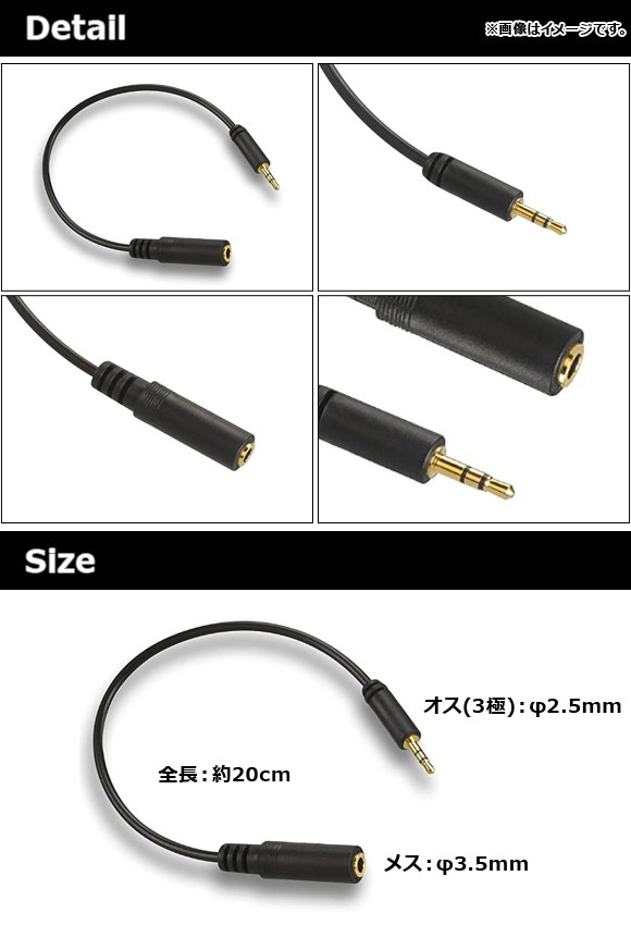 入数:1個φ2.5mmのオス(3極)とφ3.5mmのメスのオーディオ変換ケーブルです。音質の劣化を防ぐ金メッキ仕様です。サイズ/タイプ:オス 2.5mm (3極) メス 3.5mm金メッキ[端子]オス(3極):2.5mm-メス:3.5mm [サイズ]約20cm※こちらの商品は純正品ではございません。※入荷時期により、若干の仕様変更がある場合がございます。※この変換ケーブルはマイク機能はありません。※3.5mm端子にはTRSだけ対応します。※全ての機器の動作保証をするものではありません。型式、規格等によっては適合しない場合もございます。※ご使用後の交換、返品、返金は承りかねます。※当商品は輸入品の為、多少の汚れ、スレがある場合がございます。※本製品を使用する事により発生した事故、損傷、破損、損害等に関して弊社では責任を負いかねます。■関連事項AUXケーブル ステレオケーブル 接続ケーブル オーディオケーブル イヤホンケーブル ケーブル ピンケーブル ショートケーブル 変換ケーブル オーディオ延長コード ステレオ延長コード 延長ケーブル 音楽 サウンド ミュージック オーディオ ステレオ 音源 スピーカー 延長 変換 接続 イヤホンジャック ステレオミニプラグ プラグ ミニプラグ 端子 パソコン PC スマホ スマフォ スマートフォン ヘッドホン ヘッドフォン ポータブル機器 デスクトップ 周辺機器 タブレット 携帯 3.5ミリ 2.5ミリ 金メッキ■JAN4570023581788