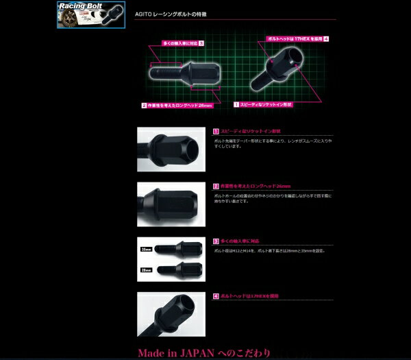 アギトAGITO Racing Bolt レーシングボルト(クロムモリブデン鋼)M12xP1.5 首上28mm 20本