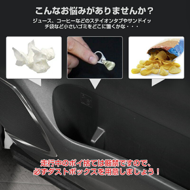 関連商品 シフトノブ アルファード40系 メッシュカーテン アルファード40系 サンシェード アルファード40系 商品情報 適合車種 適合車種:トヨタ アルファード/ヴェルファイア 40系 適合型式:AGH40W、AGH45W、AAHH40W、AAHH45W、TAHA40W、TAHA45W、AAHH40W、AAHH45W 適合年式:2023年(令和5年)6月 ※Gグレードには取付出来ません。 ※フロントドアポケットに追加オプションが装着されている車両へは取り付けできません。 ※画像とお車をご確認の上お買い求めください。 材質 ABS樹脂 カラー ブラック セット内容 サイドボックスゴミ箱×2P サイズ 本体:約116*175X*81mm 開口部:約60*62mm 取り付け場所 フロントドア(運転席と助手席) 商品説明 サイドボックスゴミ箱 ALPHARD/VELLFIRE アルファード/ヴェルファイア 40系 完全車種専用設計 フロントドアポケットにジャストフィット。 耐久性に優れたABS樹脂を採用 ガタツキを防止するクッションつき ゴミ箱の側面に緩衝材がついているので走行中のガタツキ音を軽減。 コンパクト・軽量 わずか300g フロントドアポケットにすっきり収まるダストボックス。 乗降時には影響がありません。運転に邪魔しないちょうどいい容量。 捨てたゴミが見えないフタ付き 密閉性の高い車内によるニオイが出やすいでしっかり閉じることすると気になるニオイが漏れにくいです。お車に置いても、安心して使えます。 車内をいつも清潔に!! たまったゴミは本体を上部を取り外して簡単に捨てることができます。 ドアの開閉に影響無し 車内スペースを活用 ゴミ袋不要、水洗い可能 注意事項 ※ 製品の仕様は予告なく変更になる場合がございます。ご了承下さい。 ※お客様がご利用のモニターの設定及び特性により、実際の商品とは色味が異なる場合がございます。