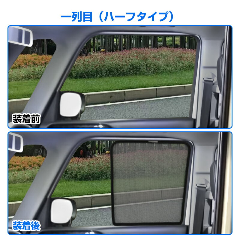 スズキ スペーシア/スペーシアカスタム/スペーシアギア メッシュカーテン 商品仕様 セット内容: タイプA:一列目(フルタイプ)×2P、取付部品×1式 タイプB:一列目(ハーフタイプ)×2P、取付部品×1式 タイプC:二列目×2P、取付部品×1式 タイプD:一列目(フルタイプ)+二列目×4P、取付部品×1式 タイプE:一列目(ハーフタイプ)+二列目×4P、取付部品×1式 適合車種:スズキ スペーシア/スペーシアカスタム/スペーシアギア MK54S/MK94S 2023年11月~ ※形状をご確認の上ご注文お願い致します。 ※運転中の使用や装着は大変危険ですので、交通法を違反しないように絶対にやめてください。 形状: 一列目(フルタイプ/ハーフタイプ) 二列目(フルタイプ) カラー:ブラック 商品説明 POINT01:車種専用設計。現車採寸なので最高のフィット感を実現し、加工せずそのまま取付のが可能な専用設計デザイン。 POINT02:紫外線対策と、適度に明るい車内。UVカットと同時に、車内の明るさも確保して快適なドライブを。 POINT03:プライバシー保護、盗難防止、車内に置いてる貴重品が心配無し。人目を気にせずプライベート空間を保つことができるため、キャンプなどのアウトドアの車中泊や着替えをする場合に便利です。車内でゆっくり仮眠や食事をとりたい時にも活用できます POINT04:遮光性が高く通気性のよいメッシュ素材を採用するので。外からの目隠しになるのはもちろん、車内から外の景色を眺めるのに丁度よい遮光性となっています。 POINT05:マグネットだからワンタッテで取り付け、取り外し!マグネットで窓枠の金属部分にバチッと貼り付けるだけ。別途工具など一切不要、初心者の方にも簡単で購入してすぐに使用できます。利用しない際に着脱も簡単です。 注意事項 ※ 製品の仕様は予告なく変更になる場合がございます。ご了承下さい。 ※お客様がご利用のモニターの設定及び特性により、実際の商品とは色味が異なる場合がございます。 ※当店でご購入された商品は、原則として、「個人輸入」としての取り扱いになり、中国の広東省からお客様のもとへ直送されます。 ※一部商品は国内の提携先倉庫から配送されます。 ※個人輸入される商品は、全てご注文者自身の「個人使用/個人消費」が前提となりますので、ご注文された商品を第三者へ譲渡?転売することは法律で禁止されております。 ※国外から配送される商品は、通関時に関税/輸入消費税が課税される可能性があります。 ※課税額はご注文時には確定しておらず、通関時に確定しますので、商品の受け取り時に着払いでお支払いください。詳細はこちらご確認下さい。 ※国内配送の商品は国内でのお買い物と同じく消費税が発生いたします。関税はかかりません