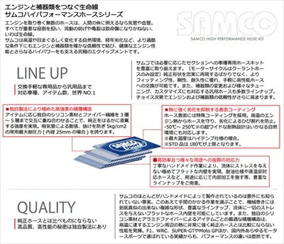こちらの商品に関連する商品が他にございます。下記詳細を必ずお読みになり、ご注文をお願いします。標準カラー:レッドはこちらオプションカラー:ホワイトはこちら標準カラー:オレンジはこちらオプションカラー:ヴィンテージブラックはこちらオプションカラー:ブリティッシュレーシンググリーンはこちら標準カラー:グリーンはこちらオプションカラー:パープルはこちら標準カラー:ブルーはこちらオプションカラー:ガンメタリックはこちら標準カラー:イエローはこちら標準カラー:ブラックはこちらオプションカラー:ヴァイパーレッドはこちらAS商品コードSAMZ000124-012-00メーカーサムコメーカーコード40TB1827商品説明等【エンジンと補器類をつなぐ生命線 サムコハイパフォーマンスホースシリーズ】■サムコハイパフォーマンスホースシリーズは高温や目まぐしく変化する自然環境、経年劣化など、より過酷な条件下にもエンジンと補器類を確かな信頼性で結び、健康なエンジン性能とさらなるハイパワーをも支える究極のエクイップメントです。■純正形状を忠実に再現するばかりでなく、よりフィッティング性、剛性、耐久性に優れ、手軽に高性能ホースへの交換が可能です。■独自のシリコン素材とアラミドファイバーによるアイテムごとの最適な積層構造は、高温に達するエンジン周辺の熱に非常に強く、純正ホースとは比較にならない性能を発揮します。■F1、WRC、SUPER-GTやMoto GPほか、国内外あらゆるモータースポーツで選ばれている実績からも、パフォーマンスの違いは歴然です。【セット内容】■インダクションホース:1本■ホースバンド:2本【注意事項】※受注発注のため納期10〜12週間程度かかります。※サムコは生産ロットにより、ホースごとに色合いが異なる場合があります。 また、ロゴの有無およびデザイン、位置についても異なる場合があります。予めご了承ください。キーワードSH5 SH9 SHJ EJ20 FB20 EJ25 FB25 EJ25 EE20 forester SHフォレスター フォレスターSHSAMCO サムコ 猛暑対策 オーバーヒート防止 カスタマイズインテークパイプ エアロパーツ チューニングパーツ アフターパーツ AERO■ご注文時の注意事項 ※必ずご確認ください!●商品について・商品写真は実際の商品と色やイメージが異なる場合もございます。・ご注文前に必ず、商品名や商品説明をご確認ください。●納期について・商品名に、「在庫品」等の表記がない商品は、メーカー取寄品になります。・メーカー欠品時は、数ヶ月かかる場合もございます。・ご注文時のその他記入欄に、「納期確認後、注文可否」と記載の場合、当店からの納期連絡に対し、ご返信頂き次第の手配となります。 ※ご注文前の納期のお問合せは、ご注文時と納期が異なる場合がございますのでお受けしておりません。●ご注文後について・納期2ヶ月以上見込みの場合・車両情報の確認が必要・個人宅直送不可で発送先の変更が必要な場合等、「ご返信をお願いします」という件名でメールをお送り致します。 ご確認後、必要事項のご返信をお願い致します。・ご返信が無い場合、ご注文から2週間経過後、楽天本部による自動キャンセルとなります。●キャンセル・変更について・お客様都合によるキャンセルや変更はお受け出来ません。・納期が遅い等によるキャンセルもお受けできません。 ※但し、生産終了や掲載金額相違の場合は、キャンセルさせて頂く場合がございます。●発送について・エアロパーツ等の大型商品は、個人宅への直送が出来ません。塗装・取付店等の業者様を発送先にご指定をお願いします。・オートバックス店舗受取サービスもご利用頂けます。但し、お引取り時に店舗レジにて、手数料¥880(税込)のお支払いが必要です。・沖縄・離島等、一部地域は送料着払いもしくは、別途送料が追加になります。その場合はご連絡を致します。●発送後の商品について・塗装・加工・取付後の交換や返品は、理由を問わず一切お受けできません。 ※メーカー誤発送の場合でも、商品発送後1週間以上経過後はご対応出来ません。フォレスター SH5 NA インテークホース+ホースバンドセット オプションカラー:マットブラックメーカー:サムコ | SAMCO