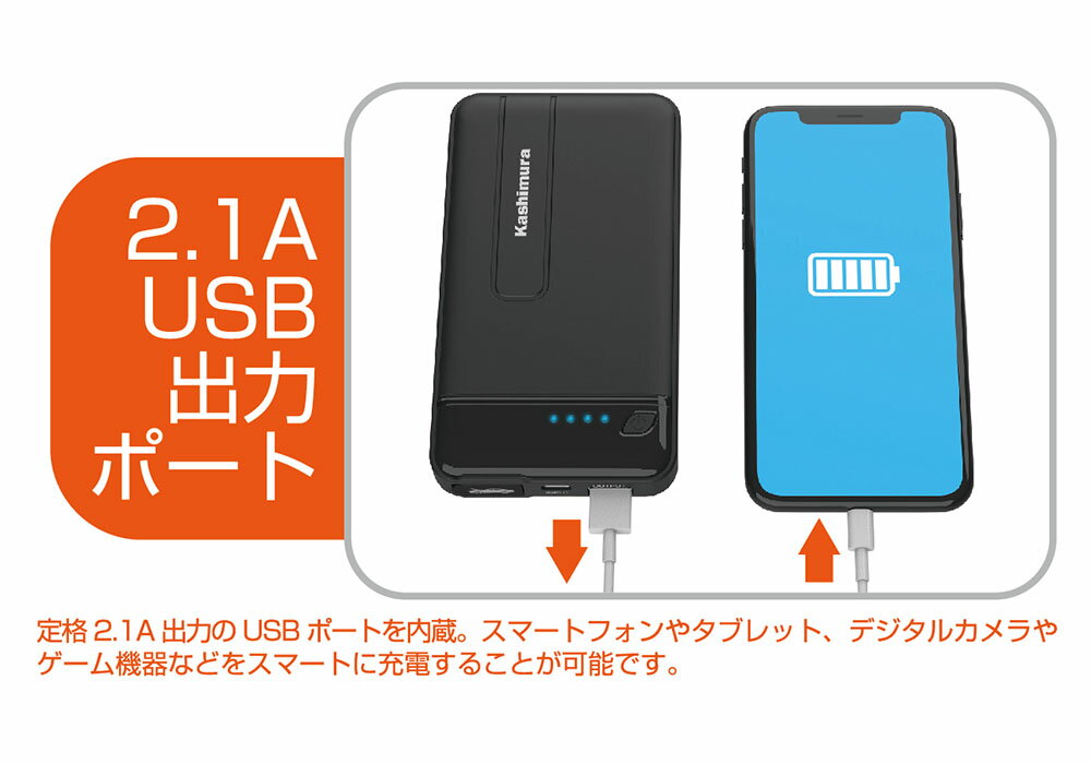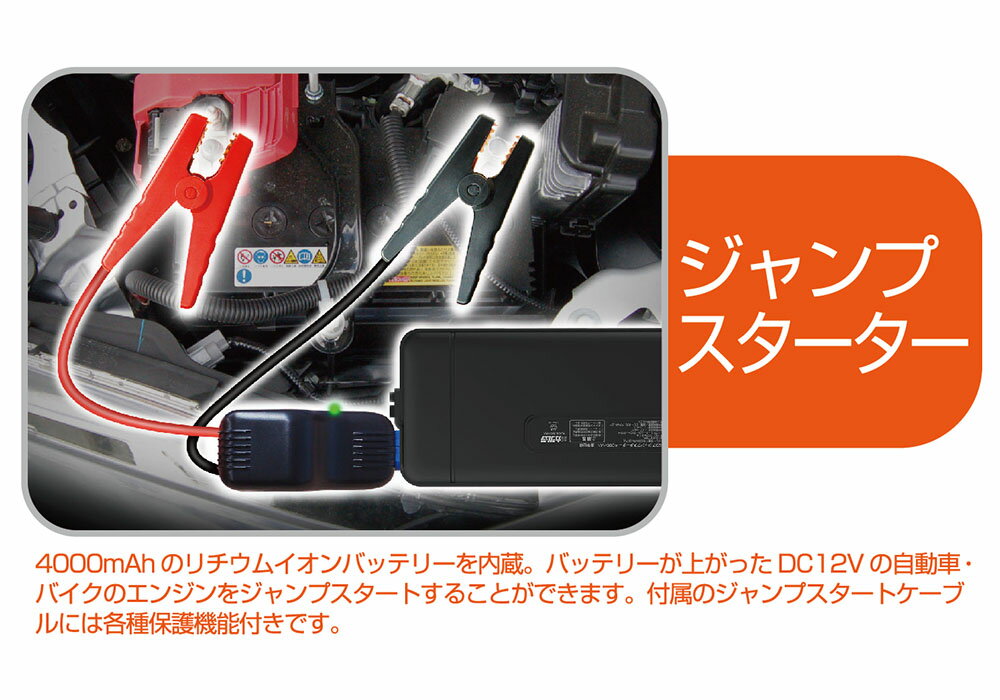 ◇ 急な車両のバッテリー上がりに、備えて安心な4000mAhバッテリー内蔵のジャンプスターター ◇ ガソリン車3.0L / ディーゼル車1.5Lまで対応 ◇ 各種保護回路機能を内蔵したジャンプスタートケーブルを付属 ◇ モバイルバッテリーとして使用可能な定格2.1A出力のUSBポートを内蔵。スマートフォンやデジタル機器の充電が可能 ◇ 車両のDC12Vカーソケットから本体の充電が可能なDC充電器と充電用ケーブルを付属 ◇ 暗い場所や夜間の作業に便利なホワイトLEDを内蔵。非常時に役立つストロボ◇ SOS点滅への切り替えも可能 ◇ 本体と付属品をまとめて収納可能なソフトケース付き ※パソコンでの充電はおやめください。また必ず出力2A以上のUSB機器で充電してください。 品番KD-237 バッテリータイプリチウムイオンバッテリー バッテリー容量4000mAh(3.7V) 入力DC5V 2A USB出力DC5V 2.1A ジャンプスターター出力300A〜600A 本体充電用DV12V-USB充電器 USB出力DC5V 2.1A ジャンプスタート対象車の目安2輪/4輪ともにDC12V ガソリン車:3.0L以下 ディーゼル車:1.5L以下 本体充電時間最大約4時間 充電可能回数約1000回 使用温度範囲-10度〜40度 充電用ケーブル長約1m(USB-A-Type-C) ジャンプスタートケーブル長プラス端子側:約18cm マイナス端子側:約9cm(保護回路ボックスからの長さ) 付属品保護回路付きジャンプスタートケーブル/本体充電用ケーブル/本体充電用DC12V-USB充電器/本体◇ 付属品収納用ソフトケース 本体サイズ / 重量140W×19H×77Dmm / 230g 関連ワード:カー用品 保護回路内蔵 LEDライト アウトドア