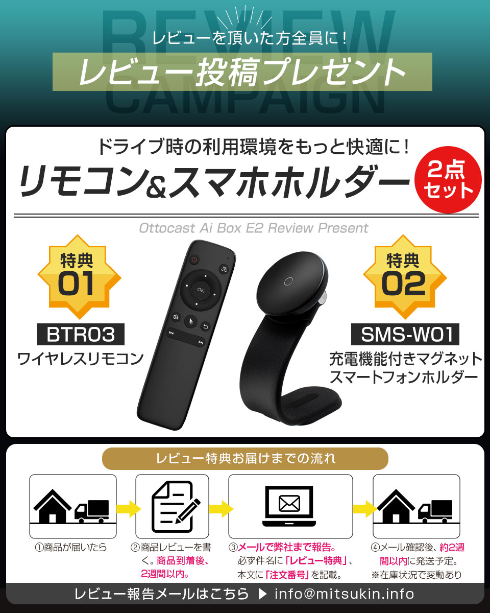 オットキャスト ( OTTOCAST ) ottocast Otto Aibox E2 carplay AndroidAuto ai box PCS5 E2 [Otto AiBox E2] オットキャストOttoAibox E2は、Android 13 OSベースで動いており、長距離ドライブや通勤時で車内で快適に動画や音楽を楽しめます。二分割画面機能により、運転席ではナビアプリ、助手席では動画アプリを同時表示し、安全かつ快適にエンタメを楽しめます。さらに、マイクロSDカードで各種メディアを再生できたり、 CarPlay と Android Autoをワイヤレス接続もできたり、Bluetoothハンズフリー通話も対応可能です。様々な便利機能で豊かなカーライフが広がっています。 【商品内容】 - 本体 - USB Type-C-Aケーブル - USB Type-C-Cケーブル - USB Y字ケーブル - 取扱説明書(日本語対応) 【仕様】 品番:PCS55/E2 オペレーションシステム:Android 13 メモリー:(RAM)4GB、(ROM)64GB 外部メモリー:MicroSDカード256GB対応 通信:(4G)NanoサイズSIM(対応バンド:3G WCDMA: B1/B6/B8/B9/B19、4G LTE-FDD: B1/B3/B6/B8/B9/B18/B19/B26/B28、4G LTE-TDD: B41) (Wifi)Dual-band802.11 a/b/g/n/ac 2.4ghz+5GHz Bluetooth:5.0 GPS:ビルドインGPS GLONASS コネクター:Type-C USB, Nano SIM, Micro SD card 電源:USB 5V1A サイズ:77×77×18.5mm(本体のみ) 重量:約82g(本体のみ) 動作温度:-20〜70℃ 対応車種:有線接続でのCarPlayまたはAndroid Autoに対応した2016年以降の車両やナビシステム。 ご利用になられる車やナビシステムにUSBケーブルを利用してWifi、BluetoothをオフにしたiPhone、androidスマートフォンを接続し、Carplay、AndroidAutoが起動することを確認してください。 一部の外国車には対応しない場合がございます。 タッチパネル式のモニターのみサポートします 【各個別の車両、ナビシステムへの適応、アプリの対応等の確認のお問い合わせは承ることができません】お客様の判断でご確認ください。 また、各種アプリに関する情報に対するのお問い合わせは承ることができません。CarPlayまたはAndroid Autoに対応するアプリの情報はそれぞれの公式ホームページをご確認ください。 また、これらの適応に関する問題での返品等は承ることができません。 【HDMI出力について】 こちらの商品はhdmi出力が無いため、後部座席のモニター視聴はできないので注意してください。 型番:ottocast Otto Aibox E2 [検索キーワード] カー用品Android13.0 4GB 64GB nanoSIM対応 GPS 純正ナビ バイク用品 カーナビ カーオーディオ 車 自転車 自動車 カーAV その他カーナビ