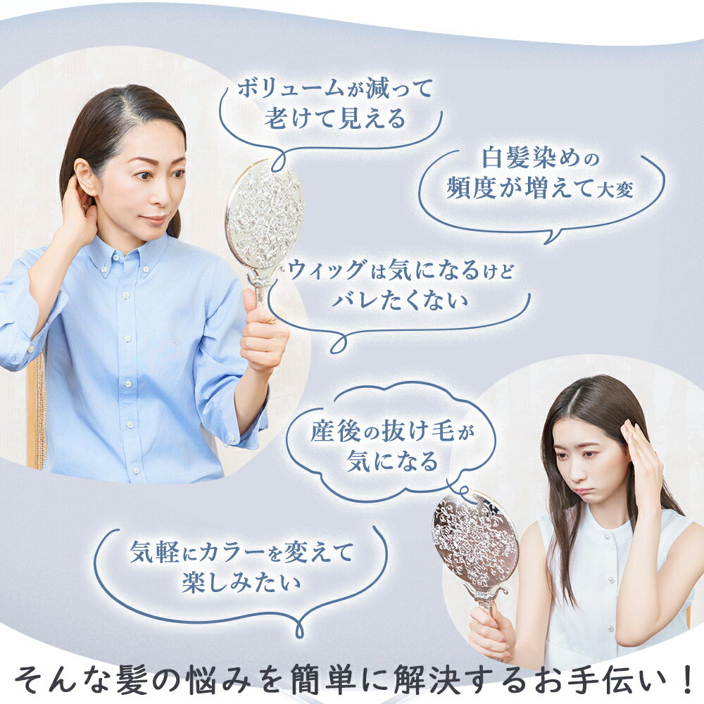◎ボリュームが減って老けて見える ◎白髪染めの頻度が増えて大変 ◎ウィッグは気になるけどバレたくない ◎産後の抜け毛が気になる ◎気軽にカラーを変えて楽しみたい ↓ ↓ ↓ そんな髪の悩みを簡単に解決するお手伝い 軽い!薄い!簡単!日常使い!お手頃価格! 軽くてスリムで白髪や薄毛などのあらゆる髪のお悩みを“ちょびっと”カバーできるプリシラ白髪隠しウィッグの新シリーズです。 幅広い地毛の長さに対応する「スタンダード」タイプと、ロングヘアの方にぴったりな「ロング」タイプの2種類をご用意。 髪のお悩みカバーアテムとしてだけでなく、アンブレラカラー使いも楽しめるハイトーンカラーや、グレイカラー(白髪カラー)も充実しています。 実用品として、ファッションアイテムとしても使い勝手の良いアイテムです。 ■ウィッグのタイプ マシンメイド耐熱白髪隠しウィッグ(部分ウィッグ/ヘアピース) ※フルウィッグではありません 頭頂部のカバーに適した部分ウィッグです。 2つのクリップで髪に固定して使用するウィッグとなります。 ■サイズ・仕様 【スタンダードタイプ】 つむじから前:約18cm、後ろ:約30cm 【ロングタイプ】 つむじから前:約18cm、後ろ:約50cm 【共通】 スキン部分/縦:約9cm,横:約3cm 人工スキン:有り クリップ2個付き(前側:黒1個、後側:茶1個) ■素材 【ナローミックスファイバー】 従来の新ファイバーよりさらに細いファイバーをミックスし、より本物の髪に近い質感の耐熱ファイバーです。 (プリシラ比:約23%太さを軽減) ※ただし、THBカラーは従来の新ファイバー使用となります。 【耐熱】耐熱温度180度、コテやカーラーで巻く場合は同封の取扱説明書をご覧ください。※(適温130~150度) ■カラー 1N:ブラック 2N:ナチュラルブラック 3A:ダークブラウン 4A:ブラウン THB:耐熱ハニーブロンズ TNGH:耐熱ナチュラルグレイヘア TLGH:耐熱ライトグレイヘア 2NHM:ナチュラルブラックハイメッシュ 3AHM:ダークブラウンハイメッシュ ちょびっと白髪隠しウィッグ プリシラ ST-012 スタンダードタイプ・ロングタイプ> 白髪隠しウィッグ ST-004 白髪隠しウィッグ ST-005