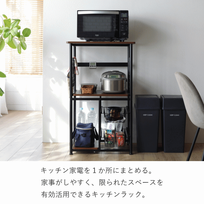 キッチンラックの解説 調理家電や食材ストックを機能的でシンプルにまとめるキッチンラック。キッチン家電を1か所にまとめる。家事がしやすく、限られたスペースを有効活用できるキッチンラック。悩めるキッチン収納の救世主です。 中棚はスライド式。蓋を開く電子ジャー等にも使いやすく、蒸気を発生させる家電の設置に最適です。 オープンラックでお部屋に与える圧迫感も少なくワンルームの限られた空間でも活躍します。 絶妙な高さ100cmの天板は作業スペースとしても最適です。 大型レンジも設置可能なゆとりある天板。重量のあるキッチン家電も安心して設置できます。 使い勝手の良いスライド棚。炊飯器や電気ポットはここに。引き出して使えば家電の熱や蒸気を逃がすことができます。 フタ付き家電の開閉も楽に行える高さです。引き出しすぎ防止のストッパー付き。 サイド部分はお手持ちのS字フックを活用すればふきんやミトンなどを掛けて収納できます。※S字フックは付属しません。 通気性のあるバスケット引き出し。食器やラップなど食材のストックをすっきり収納できます。 2Lペットボトルを立てて収納できるスペース付き。 アジャスター付きでガタツキを防止します。 キッチンラックの詳細 サイズ (約) 幅60×奥行46×高さ100cm 重量(約) 15kg 耐荷重(約) 全体:50kg、天板:25kg、スライド棚:10kg、下棚:10kg、カゴ:3kg 材質 天板・棚板:MDF(15mm厚)、PVC貼り フレーム:スチール(φ25mm)、粉体塗装 仕様 組立品(組立時間:約30分)、カゴと中棚はスライド式 キーワード レンジ台 キッチンラック 大型レンジ台 60cm幅 ヘルシオサイズ設置OK レンジラック 60幅 白 スリム ラック キッチン 収納 ラック おしゃれ 北欧 棚 オーブンレンジ レンジボード 食器棚 キッチンカウンター 一人暮らし 家電ラック スチール製 電子レンジ 炊飯器 隙間収納 大型レンジ対応 シェルフ ハイタイプ 大容量 レンジ 上 キッチンボード オープンラック 3段 キッチン収納 キッチン棚 ストレージラック シンプル ナチュラル 木製 木目 幅60cm すきま収納 収納棚 オシャレ ランドリー キッチン リビング 洗面所 マルチラック すき間 隙間 省スペース 組み立て 組立 新生活