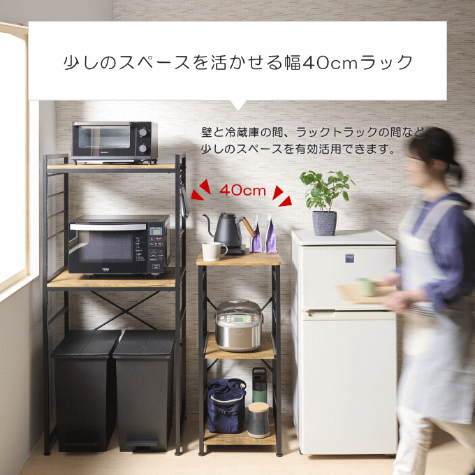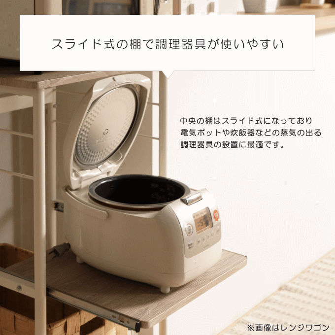 スリムキッチンラックの解説 調理家電や食材ストックを機能的でシンプルにまとめるスリムキッチンラック。キッチン家電を1か所にまとめる。家事がしやすく、限られたスペースを有効活用できるスリムキッチンラック。悩めるキッチン収納の救世主です。 中棚はスライド式。蓋を開く電子ジャー等にも使いやすく、蒸気を発生させる家電の設置に最適です。 オープンラックでお部屋に与える圧迫感も少なくワンルームの限られた空間でも活躍します。 絶妙な高さ90cmの天板は作業スペースとしても最適です。 使い勝手の良いスライド棚。炊飯器や電気ポットはここに。引き出して使えば家電の熱や蒸気を逃がすことができます。 フタ付き家電の開閉も楽に行える高さです。引き出しすぎ防止のストッパー付き。 サイド部分はお手持ちのS字フックを活用すればふきんやミトンなどを掛けて収納できます。※S字フックは付属しません。 2Lペットボトルを立てて収納できるスペース付き。 アジャスター付きでガタツキを防止します。 スリムキッチンラックの詳細 サイズ (約) 幅40×奥行45×高さ90cm 重量(約) 9kg 耐荷重(約) 全体:30kg、天板:15kg、スライド棚:10kg、下棚:15kg 材質 天板・棚板:MDF(15mm厚)、PVC貼り フレーム:スチール(□20mm)、粉体塗装 仕様 組立品、中棚はスライド式 キーワード キッチンラック スリム 40cm幅 40幅 白 スリム ラック キッチン 収納 ラック おしゃれ 北欧 棚 食器棚 キッチンカウンター 一人暮らし 家電ラック キッチン収納 すき間 隙間 オープンラック 3段 スチール製 炊飯器 隙間収納 シェルフ ハイタイプ 大容量 キッチンボード キッチン棚 ストレージラック オーブンレンジ レンジボード 電子レンジ シンプル ナチュラル 木製 木目 幅40cm すきま収納 収納棚 オシャレ ランドリー キッチン リビング 洗面所 マルチラック 省スペース 組み立て 組立 新生活