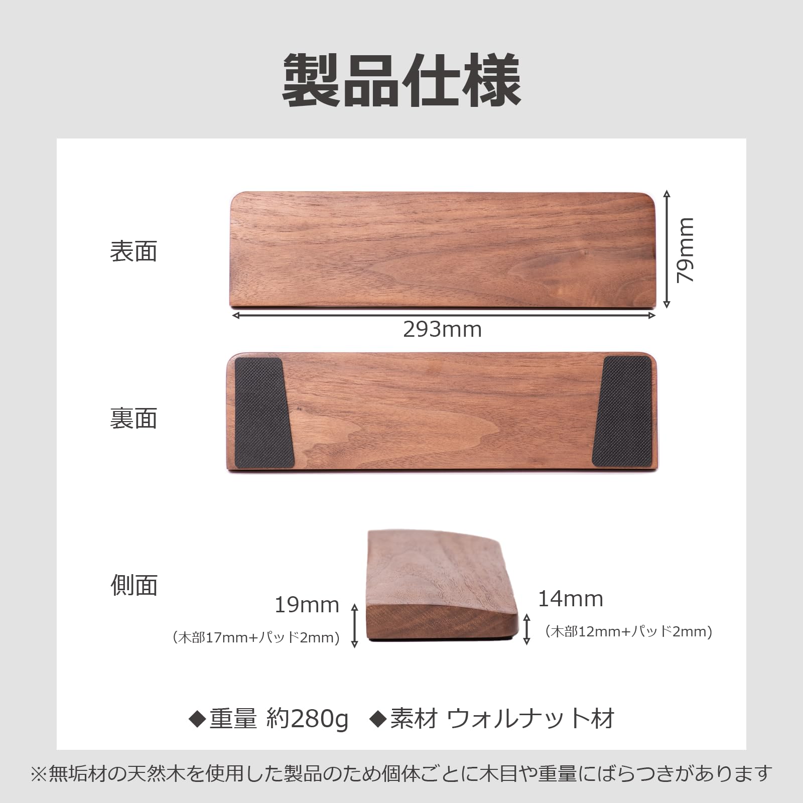 ■ HHKB用ウッドパームレスト高さ、幅共にHHKB専用設計でぴったりフィット(HHKB Studioは適用外)。クッションの様に沈み込まず、快適な位置に手首を固定して長時間のタイピングをサポートします。 ■ HHKBにピッタリ幅293mm、高さ19mmのHHKB専用設計(Studioを除く)。シンプルで美しいHHKBに違和感なくフィットする仕様です。 ■ 高級ウォルナット材使用密度が高いウォルナット材を無塗装で使用。木材の優しさを感じられ、適度な吸汗性を持っていてべたつきにくい特徴です。1500番の紙ヤスリや木材用オイルでお手入れが可能です。 ■ 製品仕様◆寸法 幅293mm 縦79mm 後部高さ19mm(木部17mm+パッド2mm) 前部高さ14mm(木部12mm+パッド2mm) ◆重量 約280g ◆素材 ウォルナット材 オイルフィニッシュ ※無垢材の天然木を使用した製品のため個体ごとに木目や重量にばらつきがあります ※一部商品の商品仕様欄に記載されている「代表カラー」は実物と異なる場合があります。特に「マルチカラー」になっているものは異なる場合が多いため画像や商品名等でご確認ください。HHKB用 ウッドパームレスト 天然木 ウォルナット無垢材 オイル仕上げ (Studioを除くHHKBに対応) 10