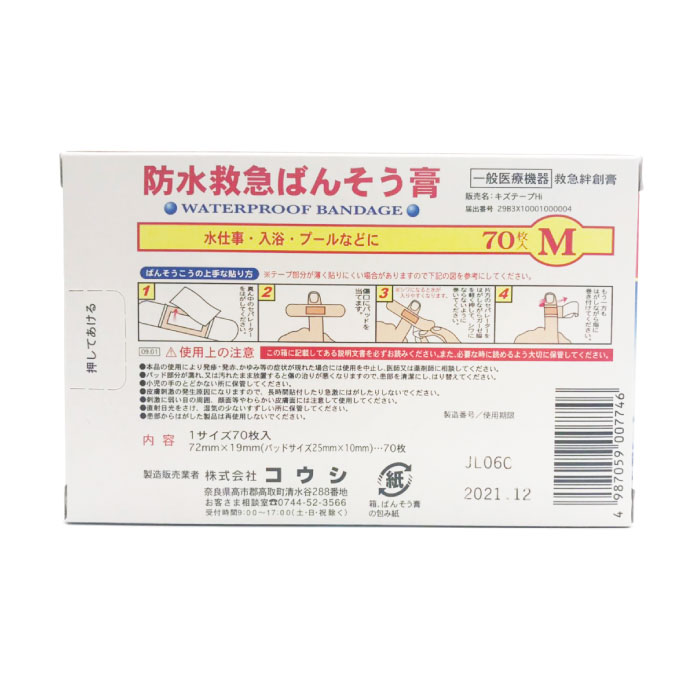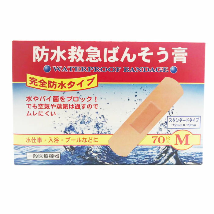 ------------------------------------------------------ 【送料無料】メール便で送料無料! ■代引き不可・日時指定不可・同梱不可。 ■ポスト投函で配達完了。 ■出荷後の住所変更および住所不備による配達が発生する場合は費用が発生する場合ございます。 ------------------------------------------------------ ●商品紹介● 完全防水タイプ 水やバイ菌をブロック! でも空気や蒸気は通すのでムレにくい 水仕事・入浴・プールなどに 防水救急ばんそう膏 Mサイズ 140枚セット(70枚入×2個) 内容量 70枚(1箱) サイズ 72mm×19mm(パッドサイズ25mm×10mm) 商品重量 45.4 g 梱包サイズ 95mm×146mm×30mm 効能 すり傷、切り傷、さし傷、かき傷、靴ずれ、創傷面の消毒・保護 対象性別 男女共用 使用上の注意 ●本品の使用により発疹・発赤、かゆみ等の症状が現れた場合には使用を中止し、医師又は薬剤師に相談してください。 ●パッド部分が濡れ、または汚れたまま放置すると傷の治りが悪くなりますので、患部を清潔にし、貼り替えてください。 ●小児の手のとどかない所に保管してください。 ●皮膚刺激の派生原因になりますので、長時間貼付したり急激にはがしたりしないでください。 ●刺激に弱い目の周囲、顔面などやわらかい皮膚面には注意して使用してください。 ●直射日光をさけ、湿気の少ないすずしい所に保管してください。 ●幹部からはがした製品は再使用しないでください。 区分 日本製/一般医療機器 医療機器届出番号:29B3X10001000004 広告文責 株式会社金橋大阪物流センター内お客様窓口電話番号:06-6221-2821 平日(祝祭日を除く)9:30〜17:30 ----------------------------------------------------★お買い得理由★【コストダウン商品】企業のコストダウンによって実現した特別価格!----------------------------------------------------