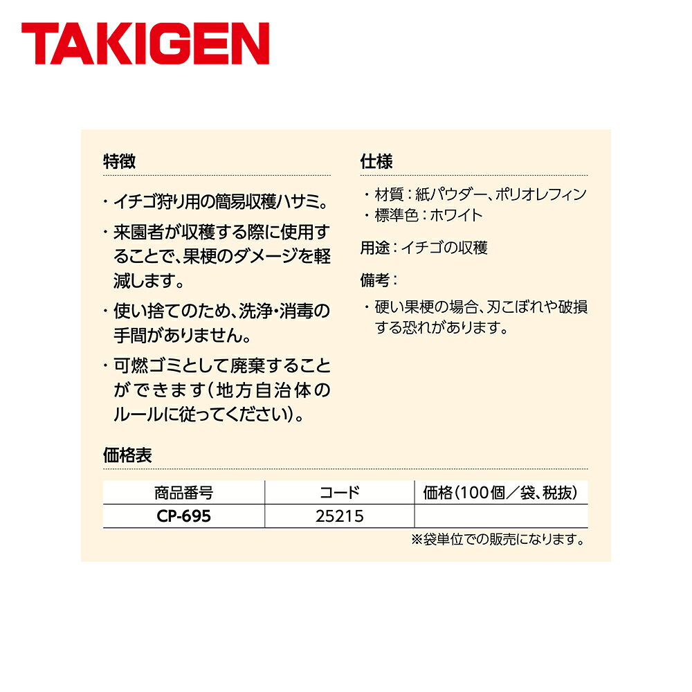【100個セット品】 ●観光農園向けに開発したイチゴの簡易収穫ハサミです。 ●来園者が収穫する際に使用することで、茎のダメージを軽減します。 ●使い捨てで可燃ゴミとして廃棄することができ、洗浄・消毒の手間がありません。 ●大人から子供まで利用できる設計 ・材質:紙パウダー、ポリオレフィン ・標準色:ホワイト ・用途:イチゴの収穫 ・硬い果梗の場合、刃こぼれや破損する恐れがあります。 ※北海道・沖縄・離島は別途中継料がかかります。 ※季節商品のため、在庫切れ及びお届けまでお時間いただく場合がございます。お急ぎの場合は在庫確認等お問い合わせください。
