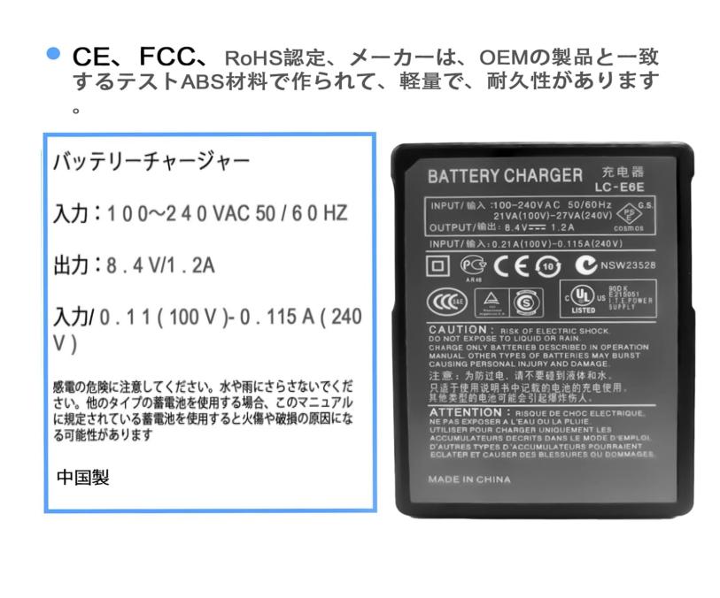 新品 Canon キヤノンLC-E6 LP-E6 LP-E6N LP-E6NH代替互換充電器・バッテリーチャージャー デジカメ Canon EOS 90D、80D、70D、60D、60DA、7D Mark II、7D、6D Mark II、6D、5D Mark IV、5D Mark III、5D Mark II、5DS、5DS R、R5、R6DSLR対応 PSE認証