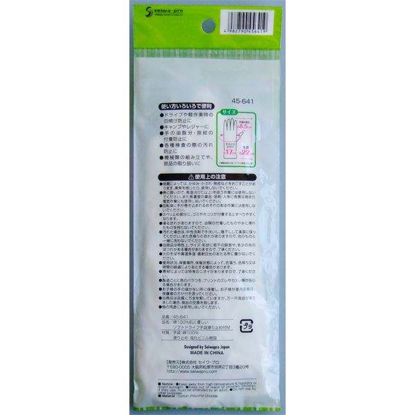 〇スベリ止め付きのドライブ手袋です。ソフトで肌に優しい綿100%です。動かしやすい指マチ付きです。ドライブの日焼け防止や、部品の取り扱い時にも便利に使えます。※熱に弱い為、高温(60度以上)を扱う作業には使用しないでください※縫製品の為サイズが異なります●サイズ(約)・全長22cm 手のひらまわり:17cm 中指の長さ:8.5cm ●材質・手袋:綿100% 滑り止め:塩化ビニル樹脂●用途・作業用グローブ 軍手 ドライブ手袋 DIY ガーデニング・園芸●キーワード・ぐろーぶ ぐんて てぶくろ さぎょう がーでにんぐ えんげい どらいぶ 運転 100均 100円均一●品名・綿100% ソフトドライブ手袋滑り止めM●品番・45-641●JAN・4982790456419●メーカー名・(株)セイワ・プロ●管理単位・12個/480個●入数・1双