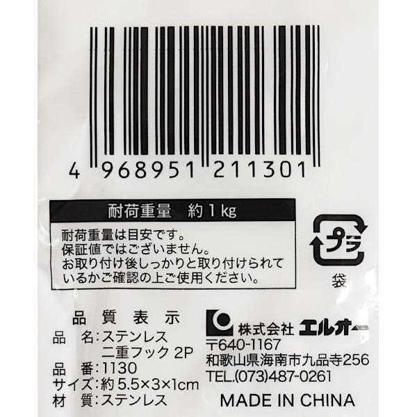 2重フック、2個入りです。2重構造のフックで横ブレしにくいです。約直径2cmまでの太さのバーに引っ掛けて使用できます。サビに強いステンレス製です。浴室の小物の収納に便利です。●1個のサイズ(約)・55×30×厚み10mm●1個の耐荷重(約)・1kg●材質・ステンレス●用途・フック ホルダー 小物掛け 収納 浴室 洗面●キーワード・ふっく ほるだー こものかけ しゅうのう よくしつ せんめん 100均 100円均一●品名・ステンレス二重フック 2P●品番・1130●JAN・4968951211301●メーカー名・(株)エルオー●管理単位・10個/200個●入数・2個