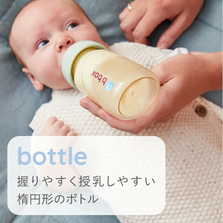 BPAフリーで医療用グレードの「PPSU」を使用し、ミルクを入れても授乳しやすい軽さ、そして消毒などの熱や傷にも耐える強度をもったb.box(ビーボックス)の哺乳びんが登場。飲み口は「アンチコリック・シリコン・ティート」を採用。成長に合わせて穴の大きさを変えていくことも可能です。オプションアイテムのハンドルを付けると赤ちゃんの自力での授乳をサポートします。 【対象年齢】0ヶ月〜 【素材】ポリプロピレン/シリコーン/ポリフェニルサルホン(PPSU) ※BPA、フタル酸エステル類、およびPVCフリーな素材を使用しています。 【容量】240ml 【耐熱温度】 フード・キャップ/100℃ 乳首・瓶/180℃ 飲み口:丸穴(ボトルには1つのティート(ステージ1、0〜2ヶ月)が付属しています) ※食洗機可能。使用後は食洗器をご利用いただけます。※こちらの商品は倉庫より直接配送する商品でございます。倉庫発送となるため、 別途商品をご注文の場合は送料が発生する場合がございます。ご了承ください。 必ずお読み下さい。 ● ご注文後のキャンセル・内容変更・決済方法変更はお受けできません。 ● お届け先、カラーやサイズにお間違いがないようご確認の上、ご注文願います。 ● ご注文後の配送日時の変更・追加ができません。