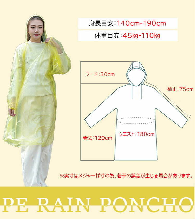 商品説明商品名 使い捨てレインポンチョです。 通常の雨具はスペースを取り、持ち運びにくいでしょう。その日に雨が降るかどうかわからない場合は、レインコートが賢い選択ですね。いつでもこれを身元に持って行っても邪魔になりません。 レジャーや旅行、フェス、災害や山歩きなどの小雨対策に 様々なシチュエーションで持ち運びしやすく、そのまま使い捨てやすい超安値なのも魅力の商品です。 素材 PE 生産国中国 サイズ フリーサイズ セット内容 10枚/50枚/100枚セット 注意 PC環境・光の具合により、色や素材のイメージが写真と若干異なる場合がございます。 モデル・写真に使用されているアクセサリー・小物は別途記載が無い限り付属いたしません。 商品に不良があった場合は、商品到着から5日以内にご連絡いただければご返金・交換対応させて頂きます。 商品のサイズは、全て平置きにて外寸を測定しております。 商品によっては+-0.5cm〜1cmの誤差が発生してしまう場合がございます。 該当商品は他店と在庫共有です。タイミングにより、在庫ズレが生じる場合がございます。予めご了承ください。