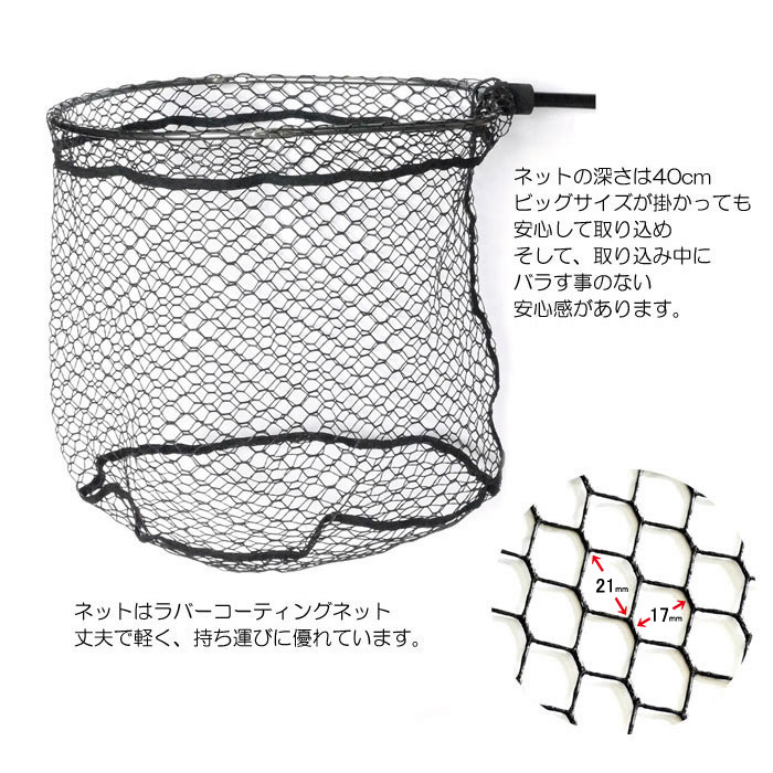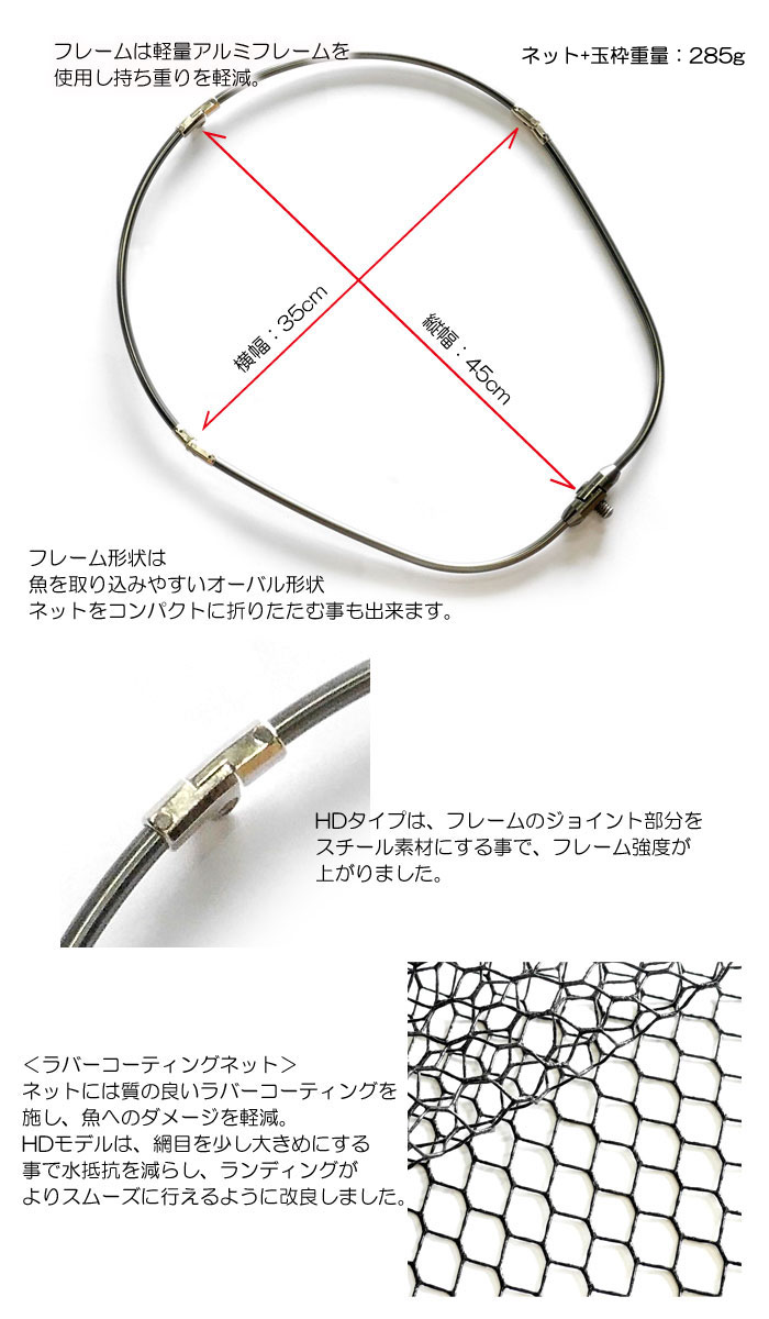 HOOTERS/フーターズLANDING NET / ランディングネット たも網 ◆HOOTERSランディングネット280HD用 たも網です。2018モデルよりHD仕様となりフレームのジョイント部分がスチール素材となり丈夫になりました。 ラバーコーティングされたネット素材なので魚へのダメージも少なく、持ち重りも軽減されています。また、四つ折り枠で、コンパクトに収納でき、携帯にも便利ですフーターズのランディングネット用の玉網ですが、他の標準的な12mmの刺し口の玉の柄にも取り付け可能です。 ※ただし、2018年モデル以前のHOOTERSランディングネット280にはねじピッチが異なるため取付できません。 ●枠形状:オーバル●枠素材:アルミ●枠サイズ:45×35cm(パイプ径8mm)●ネット深さ:40cm PVC&ラバーコーティング●重量:285gバス、シーバス、フラットフィッシュ、青物、トラウト、アオリイカなどに適しています。※本製品は網と枠のみです。玉の柄は付属しておりません。