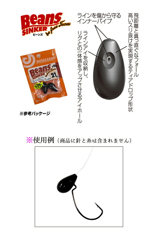 JUNGLE GYM/ジャングルジムBEANS SINKER/ビーンズシンカー◆サイズ:35g、42g、56g◆入り数:2個★テキサスリグとシンカー直付けリグ、2つの長所を併せ持つビフテキシンカー。リングロッカー、ムーブストッパーとコンビで使えばビフテキの特長である飛距離、ファストフォール、スリ抜け、ハイアピールアクション、高いフッキングを実現するハイパフォーマンスシンカーシンカーのラインを通す位置から簡単パンチショットがリグれます。キムケン愛用シンカーです。