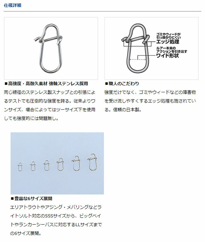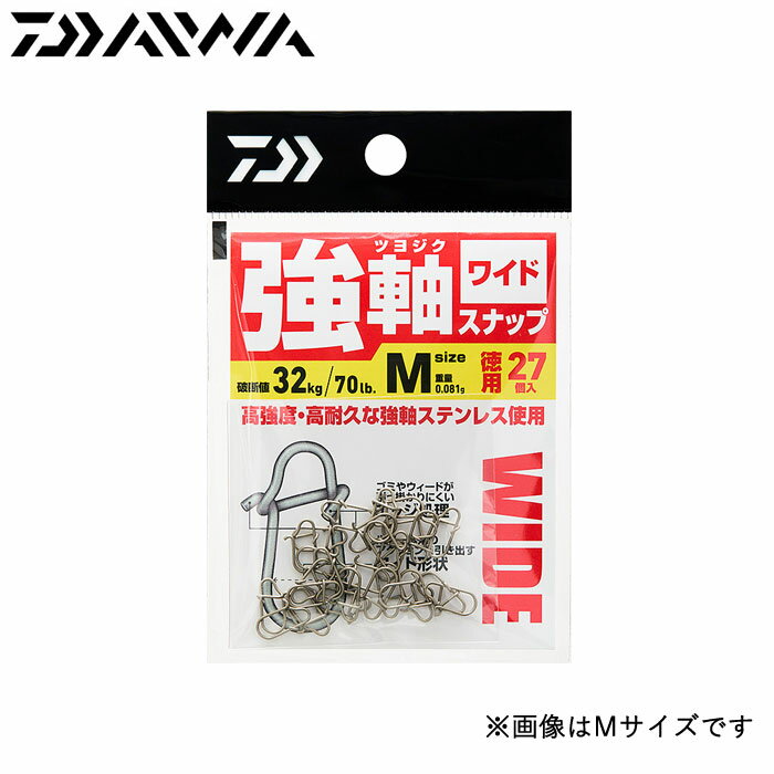 ダイワ強軸スナップ ワイド 徳用 Sサイズ:S◆線径(mm):0.5◆全長(mm):約9.3◆横幅(mm):約5.3◆自重(g):0.046◆破断強度(kg):29◆破断強度(lb):64◆入数:27★素材が違う。安心の高強度・高耐久ルアースナップ。●強軸(つよじく)ステンレス最高レベルの強度を持つばね用ステンレス鋼線を採用。通常のステンレス製スナップの約130%の引張強度(当社比)を実現。ばねに求められる優れた疲労強度特性と耐へたり特性を持ち、繰り返しの開閉使用でも安心。 ●ルアー本来のアクションを引き出すワイド形状 ルアーの稼働域が広いのでルアーアクションを十二分に引き出せる。 スローリトリーブでもしっかりとルアーを動かせる。 ●ゴミやウィードの引っ掛かりを最小限に抑えるエッジ処理 開閉部のツメは外れにくいだけでなく、障害物を受け流しやすい角度となっている。開閉しない方も同様に障害物を受け流しやすい角度に曲げてある。