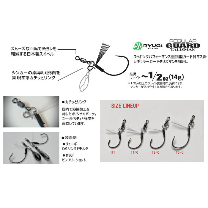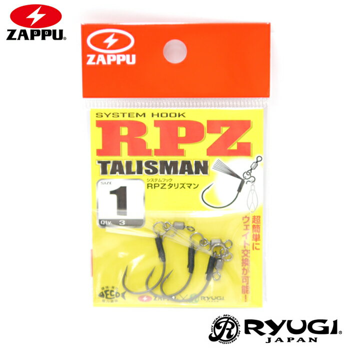 ザップシステムフック RPZタリズマン■サイズ:#1、#1/0、#2/0、#3/0 ■入数:3本 ■推奨ウェイト:~1/2oz(14g) (1/2oz以上のウェイト装着時に、負荷によりシンカーが外れやすくなる場合があります。)★RYUGI×ZAPPU 共同開発。 スピーディーなウェイト交換を可能にした直リグ専用マス針システム。 フィールドを問わず各地で釣果を叩き出し、 近年最も注目を集めるマス針での直リグ。 このメソッドでは、状況に合わせたウェイト選定と即座に掛けるフッキング性能が釣果を分けます。 掛け調子のマス針としてプロアマ問わず高い評価と実績を積み重ねるRYUGI・タリズマンに簡単スピーディーなウェイト 脱着を実現したZAPPU「カチッとリング」を搭載。性能と利便性を高めたハイパフォーマンスフックです。