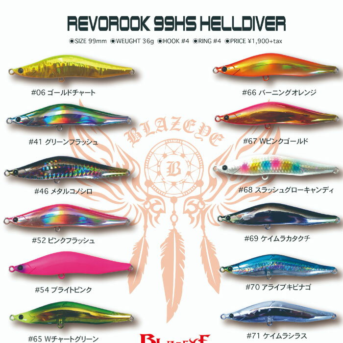 ブレイズアイ レヴォルーク 99HSヘルダイバー ■size:99mm ■weight:36g ■ring:#4 ■hook:4 ●投げてよし、巻いてよしのレヴォルークシリーズにヘビーモデルが登場。 ●ベースのレヴォルーク99Sの軽快な使用感を踏襲しつつ飛距離を大幅にUP。 ●遠浅サーフや大河川、堤防など大場所で活躍する長距離弾の登場です。