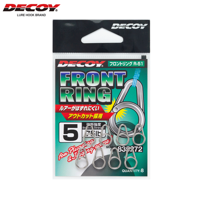 デコイR-51 フロントリング(シルバー) ■カラー:シルバー極めてコンパクトなルアー接続を実現する、リング型スナップ。ソルト/フレッシュウォーター問わず、大型ペンシルやビッグベイト等でのパワーゲームに対応。その軽量さからルアーアクションに影響を与えにくく、またアウトカットにより不意のトラブルも軽減。強化スイベル等と組み合わせれば糸ヨレが起こりにくく、激しくジャークを加えるジギング等にも最適です。●セットに工具が不要なワンタッチタイプ。 ●リング切断面は大物とのファイトでもトラブルが少ないアウトカットタイプ。 ●サビをよせつけない不動態化処理(ANTI CORROSION)採用。