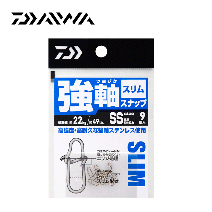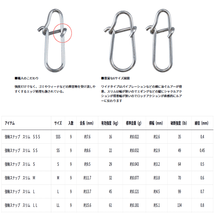 ダイワ 強軸スナップ スリム■入数:9★強度だけでない。細部までこだわったルアースナップ強軸スナップにスリムタイプ追加。 強軸(つよじく)ステンレス 最高レベルの強度を持つばね用ステンレス鋼線を採用。通常のステンレス製スナップの約130%の引張強度(当社比)を実現。ばねに求められる優れた疲労強度特性と耐へたり特性を持ち、繰り返しの開閉使用でも安心。 エギングなど縦にしゃくる釣りに有効、ワイドと比べスリム形状なのでロッドアクションがルアーに直に伝わる構造。 ゴミやウィードの引っ掛かりを最小限に抑えるエッジ処理 開閉部のツメは外れにくいだけでなく、障害物を受け流しやすい角度となっている。開閉しない方も同様に障害物を受け流しやすい角度に曲げてある。