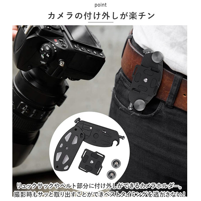 カメラ ホルダー 通販 カメラクイックリリー カメラホルダー カメラホルスター クリップ アクセサリー アタッチメント クイックリリース デジカメ 一眼レフカメラ ビデオカメラ ワンタッチ 固定 簡単 取付 セーフティーロック 腰 バッグ アウトドア キャンプ