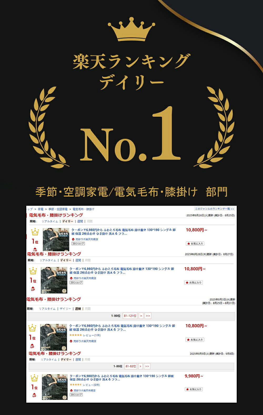 商品名2025年最新ふわとろ2枚合わせ電気毛布 掛け敷き兼用 カラーGRAY/グレー WHITE/ホワイト BLACK/ブラック サイズ ひざ掛け 80×160cm ハーフ 100×160cm シングル:130 ×190 セミダブル 150×190cm ダブル 170×190cm 重量 約2.1kgから3.5kg 素材構成フランネル (極細マイクロファイバー) 消費電力70W セット内容・電気毛布本体x1 ・コントローラーx1 ・取扱説明書x1 機能・9段階温度調節機能(30-32-34-36-38-40-42-45-50℃) ・1~12時間に12段階タイマー機能 ・過熱保護 ・急速加熱 商品について ・最新性能を詰め込み、冬をぽかぽかに ・電気毛布はほかの暖房器具と比べて電気代が圧倒的に安い点が魅力があります。 「・最低温度」で1時間使っても約0.8円なので、12時間使っても10円以下です。 ・9段階温度調節と1~12時間タイマー機能が付きます。電源を入れる時間としては寝る前の10分ぐらいがベスト。 ・ひとつで2役を果たしてくれるので、電気敷き毛布と電気掛け毛布をそれぞれ購入する必要がありません。 ・表地と裏地になめらかでやわらかな肌触りのフランネル生地シープ調を採用しました。ふわふわ・やさしい温かさが人気です! ・手触りがよいので、電源をオフにした後も毛布として快適に使えます。 ・簡単操作で、寒い冬でも暖かく快適過ごせよう ・9段階温度調節機能(30-32-34-36-38-40-42-45-50℃)が付いて、スイッチを入れるだけで手軽に体をあたためます。 ・特に1~12時間に12段階タイマー機能も搭載で、1時間単位で細かく時間設定できるものだと「少しだけ温めたい」というシーンで使いやすいです。 ・設定時間になると自動オフになるため便利です。 ・万が一切り忘れて外出、過度の加熱や電気の無駄使いも抑えることが可能です。 ・寝る前から電源を付けておけば、暖かさで思わず幸せな気持ちになります。 ・抗菌防臭加工が施されているほか、高温設定にすればダニ対策も可能。 ・さらに、本体の丸洗いに対応しているので、寝汗などで汚れた場合も手軽にお手入れできます。清潔に保ちたい方にピッタリ。