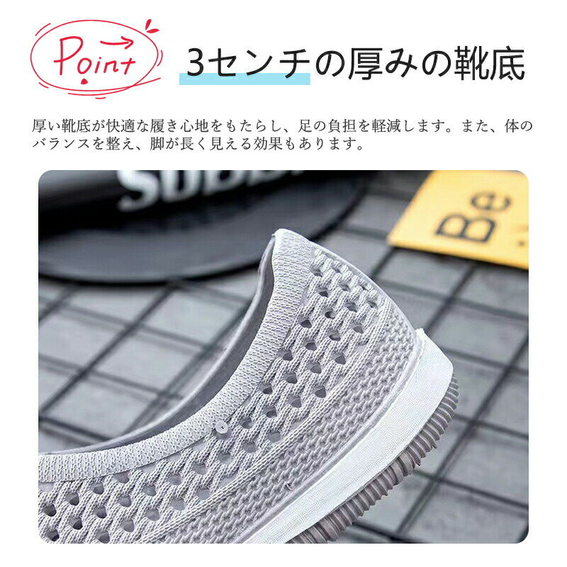 <おすすめポイント> 1. 通気性 MAX のメッシュデザイン 足元をサッキリ快適に保つメッシュ素材。暑い日も蒸れず、日常使いから軽いアウトドアまで、ファッション性と機能性両立! 2. 3 センチ厚底で “履き心地 + 脚長効果” 厚底が快適な歩行感をサポート!足の負担を軽減しつつ、体のバランスを整え、脚が長く見える視覚効果も◎ 3. 摩耗に強い高耐久素材 高品質素材の靴底は、長期間の使用にも耐えられる。毎日履いてもすぐに劣化せず、お得なロングライフデザイン 4. 超柔軟素材で “折れても形崩れなし” 編み込み素材が足に沿って優しくフィット。繰り返し曲げても形が崩れず、通勤・通学からレジャーまで、活躍場所問わず快適サポート <商品仕様> ■カラー:ブルー、ブラック、グレー ■サイズ:24.5cm-26.5cm <ご注意> ※※サイズはスタッフによる平置き実測サイズの為、1~3cm誤差が生じる場合がございます。 ※画像はイメージです。実物と多少異なる場合がございます。予めご了承くださいませ。 ※ご使用のモニター環境によって多少色合いが異なる場合がございます。 <備考> ※開封後の商品など、製品の品質の問題であれば、ご利用いただいてからのご変更や交換も対応しておりますので、ご安心ください。 ※万が一商品に不具合がある場合は、無償交換・返金は可能です。マイナス評価する前にご遠慮なく当店と連絡してください。