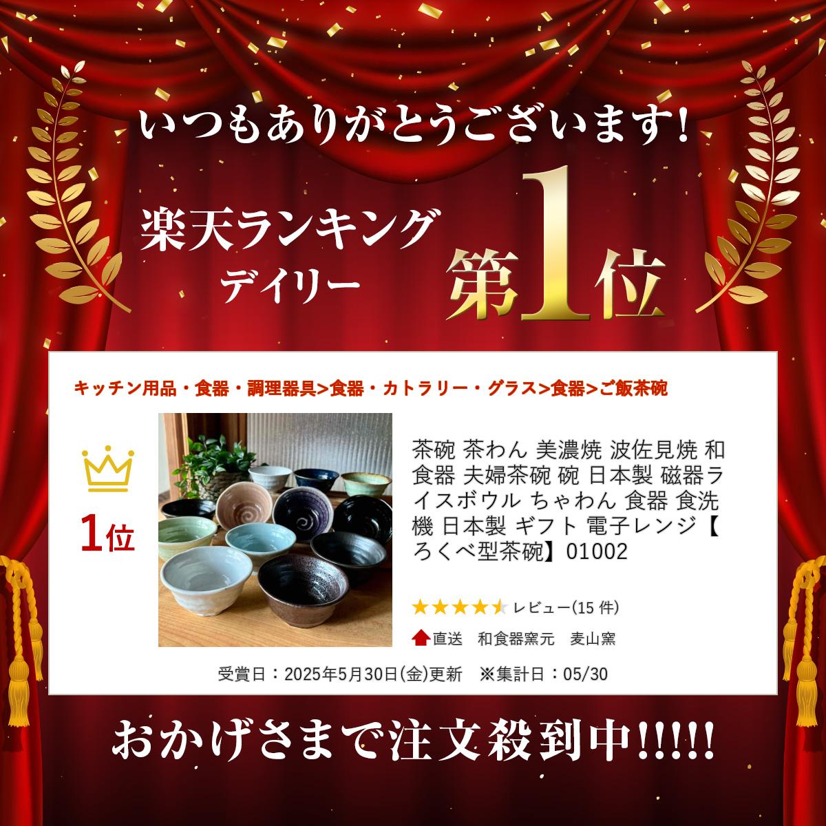 ろくべ型茶碗人気インフルエンサーの_._haru.___ 様にご紹介いただきました! 実際にこんな風に盛り付けてお使いいただいている様子をご覧いただけます。 贈り物にも、ご自宅用にもおすすめのアイテムです。【特徴】表面は手で持った際、程よく指になじむよう「ろくべ」と言う技法を用いて、表面にでこぼことした凹凸模様を施してあります。 創業から100年以上の知識と経験から、とても丈夫なうえに、積み重ねやすい形状。 毎日使う物だから、有害物質が含まれない安心の日本製食器でお食事をお楽しみください。4つのサイズをご用意しておりますので、ご家族お揃いの茶碗はいかがでしょうか。 お茶碗セットとして、贈り物にも是非お使いください。【サイズ】-概要- ろくべ型茶碗 01002 -サイズ-(手づくりの為、おおよそのサイズになります。多少の誤差はご了承ください。) ※強化とは、強化磁器土使用の製品のことです。 【豆】並土・強化 高さ:約56mm・約54mm 直径:約112mm・約110mm 【小】並土・強化 高さ:約64mm・約62mm 直径:約121mm・約117mm 【中】並土・強化 高さ:約72mm・約70mm 直径:約138mm・約135mm 【大】並土・強化 高さ:約78mm・約80mm 直径:約155mm・約150mm -仕様- 電子レンジ:OK オーブン:OK 食器洗浄機:OK -注意点- ・手作りのため、色みにムラやばらつきが生じる事があります。 釉薬の濃淡や黒点等を、器それぞれの味わいとしてご理解いただけましたら幸いです。 サイズ、容量は焼き物の特性上多少の誤差が生じますのでご了承ください。 ・表示サイズや重さについて、多少の誤差は予めご了承ください。 ・商品ページ内の画像につきましては、出来る限り実物に近いものを掲載するよう 心がけておりますが、ご使用のモニター環境等によって、カラーに差異が出てしまうことがございます。 ・在庫の無い場合は作成発送までに1~2週間程お待たせすることがございます。 ・強化磁器と並土では、焼き上がりのサイズが多少違います。品質上の問題ではありません。 ※複数ショップにて販売中の為、在庫が変動致します。 追加できるものは作成致しますので、どうぞお気軽にお問い合わせくださいませ。 ※ビードロと練り抹茶は、貫入という技法を用いて、細かいひび模様があります。 貫入入りは、作品にわざとひびを入れており美しいですが、強度がどうしても落ちてしまうことをあらかじめご了承くださいませ。 またアクアマリンは、釉薬の変更により貫入【わざとひびを入れる技法】が入りません。こちらもご了承のほどお願いいたします。 生産:麦山窯(日本製)一般的な小盛ご飯は100g程度、中盛りは150g、大盛りは250gです。 普通サイズの茶碗が【小】になります。 夫婦茶碗セットにするなら、【小】と【中】が丁度良いかもしれません。 【豆】はお子様や小食の方、【大】はいつも山盛りご飯の方や雑炊、お茶漬け、どんぶりに適しています。 〈麦山窯スタッフの意見〉 40代女性の私は【小】サイズ。高校生息子は【中】サイズを使っています。お色違いもございます。 電子レンジ・オーブン・食洗機OK!【カラーバリエーション】以下からお選びください【白磁】光沢のある白色です。(強化磁器土使用) 【志野】ふわふわとした温かみのある釉薬にバニラビーンズのような黒い粒を施した絵柄です。(並土使用) 【ビードロ】ビードロは透きとおった黄緑色でツヤがあり、貫入という釉薬(うわぐすり)の部分にできる細かいひび模様が施されています。(並土使用) 【ビードロ茶フチ】口元に茶色の線を施し、ビードロ色の釉薬と化合した際に縁取りの茶色がにじみ落ち着いた雰囲気をかもし出す絵柄です。(並土使用)【ローズクォーツ】ツヤのあるくすんだピンク色で、自然な温かみと優しさを感じさせる色合いです。(並土使用) ※釉薬の調整により以前のものよりうすいピンクです。 【アメジスト】艶があり深みのある紫色でガラスのような透け感もあります。(並土使用) 【アクアマリン】ツヤのある清潔感のある水色の釉薬でコーティングしてあります。(並土使用) 【練り抹茶】挽きたての薫り高い抹茶をイメージ。温かく、なめらかなツヤのある緑色がお料理を優しく引き立たせる逸品です。(並土使用)【ラピスラズリ】深い青色藍色を持ち、深い夜空のような輝きを表現した釉薬で仕上げた器です。デニムのインディゴブルーのようなお色です。(並土使用) 【飴織部】伝統的な「織部(おりべ)焼」を、麦山窯で飴色と融合させアレンジしました。深みのある美しい緑色を、透き通る透明な釉薬で表現しました。(強化磁器使用) 【鉄仙花】こげ茶色の艶消し(マット)な釉薬の表面に透明な粒をちりばめた絵柄。(並土使用) 【いぶし黒】少しグレーがかった、つやのないマットな質感です。(並土使用)【瀬戸黒】ふんわりとした柔らかい質感の黒色の絵柄です。ザラッとした質感の上品な黒で、長年変わらず愛される人気カラーです。(並土使用) 【流釉】優しいアイボリーに少し白いミルクがかかったようなデザインの釉薬