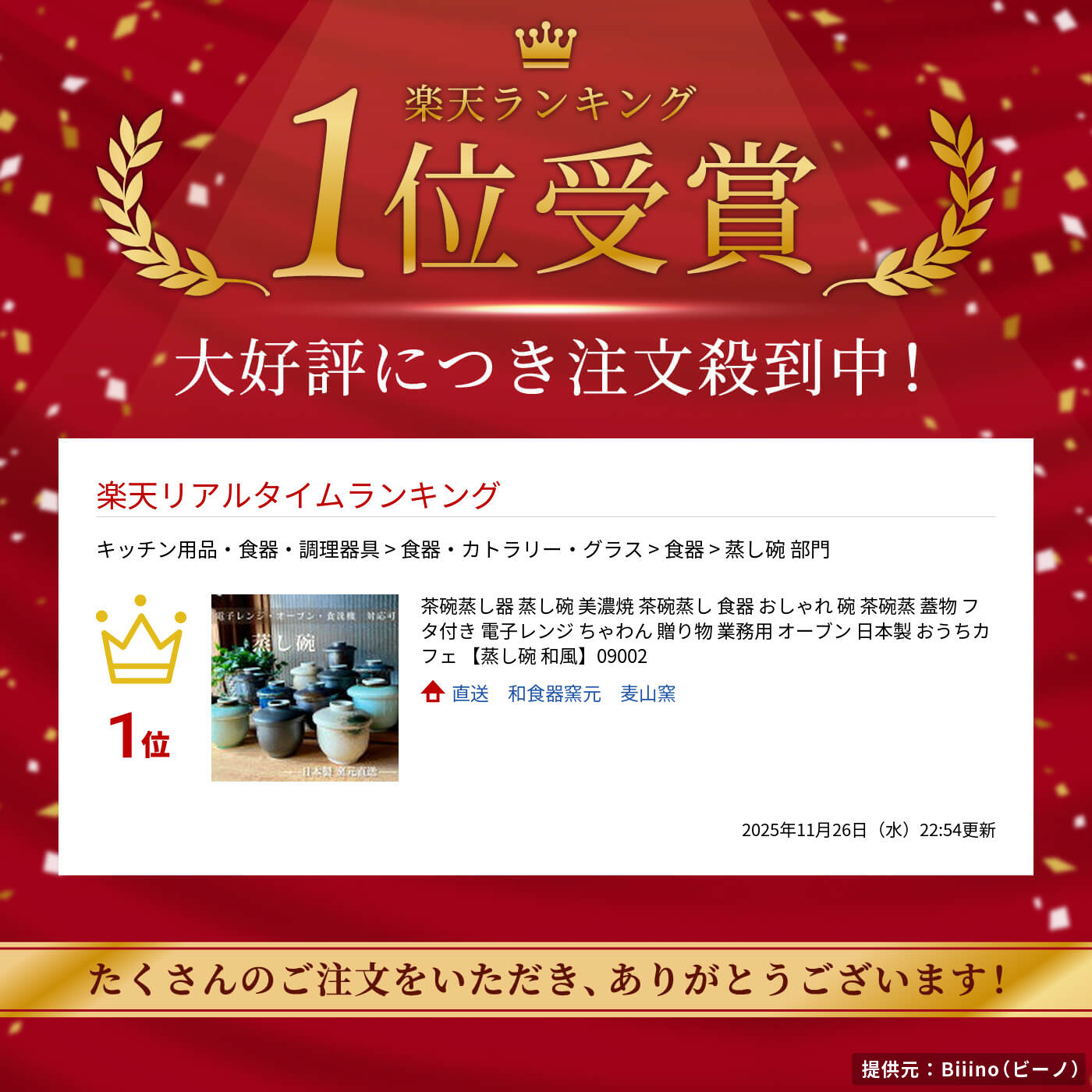 蒸し碗 【茶碗蒸し 和柄】茶碗蒸し専用のふたが付いた器です。 サイズは容量たっぷりの約240ccと、おひとりにピッタリな容量175ccの2種類ございます。 和テイストのシンプルな形状でお料理を引き立てます。 蓋を使わなければ、お蕎麦、冷や麦、そうめん等のおちょことしても活躍してくれます。 プリンなどのスイーツカップとしてもよく合います。 蒸し器に、小鉢に湯のみに万能な器です。-概要- 【蒸し碗】 商品番号:09001.09002 サイズ 並土・小 高さ:約83mm 直径:約87mm 容量:175cc 並土・大 高さ:約87mm 直径:約91mm 容量:240cc 素材:並土 -仕様- 電子レンジ:OK オーブン:OK 食器洗浄機:OK -注意点- ・手作りのため、色みにムラやばらつきが生じる事があります。 釉薬の濃淡や黒点等を、器それぞれの味わいとしてご理解いただけましたら幸いです。 サイズ、容量は焼き物の特性上多少の誤差が生じますのでご了承ください。 ・表示サイズや重さについて、多少の誤差は予めご了承ください。 ・商品ページ内の画像につきましては、出来る限り実物に近いものを掲載するよう 心がけておりますが、ご使用のモニター環境等によって、カラーに差異が出てしまうことがございます。 ・在庫の無い場合は作成発送までに1~2週間程お待たせすることがございます。 ※ビードロと練り抹茶は、貫入という技法を用いて、細かいひび模様があります。 貫入入りは、作品にわざとひびを入れており美しいですが、強度がどうしても落ちてしまうことをあらかじめご了承くださいませ。 生産:麦山窯(日本製) カラー【ビードロ茶フチ 】口元に茶色の線を施し、ビードロ色の釉薬と化合した際に縁取りの茶色がにじみ落ち着いた雰囲気をかもし出す絵柄です。 【伊賀織部】小石が混ざったような風合いがある「伊賀(いが)」を麦山窯風にアレンジ。そこに緑色の吹付を施し、織部の雰囲気を付け足しました。 【オパール】まるで宇宙の星々がきらめくような、神秘的で幻想的な美しさのある宝石のオパールをイメージしました。ツヤがあり光の反射で美しい色彩を生み出します。【やきしめ】ひとつひとつ霧吹きで吹付を施し焼き目のムラを二色の釉薬で表現した趣のある飽きの来ない絵柄です。 【鉄結晶】光沢のあるダークブラウンを基調に、それぞれの器の大きさに合わせた太い刷毛を使って、ひと筆ひと筆大胆、かつシンプルな模様をつけた絵柄です。 【いぶし黒】少しグレーがかった、つやのないマットな質感です。電子レンジで簡単茶碗蒸し レシピ【簡単茶碗蒸し】 材料 ・粉末のお吸い物の素 1人前 ・たまごLサイズ 1個 ・ぬるま湯 180CC(お吸い物の素が溶けるようにぬるま湯です) ・具材(蒲鉾や三つ葉などお好みで) 作り方 1. ボウルにたまごを割り、カラザを取り除いて混ぜます。(泡立てないように) 2. ぬるま湯180ccにお吸い物の素を入れよく混ぜ、1のボウルに入れ、たまごと混ぜ合わせます。(泡立てないように) 3. 麦山窯の茶碗蒸し器に具材を入れ、2を静かに流し入れ、蓋をして200ワットの電子レンジで10分加熱します。 ※固まりが悪い場合は、様子を見ながら1分ずつ追加加熱してください。 やけどに注意してお召し上がりください。こちらもご一緒に茶碗蒸し容器とお揃いの柄の松花堂四方皿がございます。プリンの容器としてもお使いいただけます♪ 関連商品はこちら麦山窯 茶碗蒸し 【小】 7色 食器 レン...【木の葉型蒸し碗】木の葉 蒸し碗 茶碗...