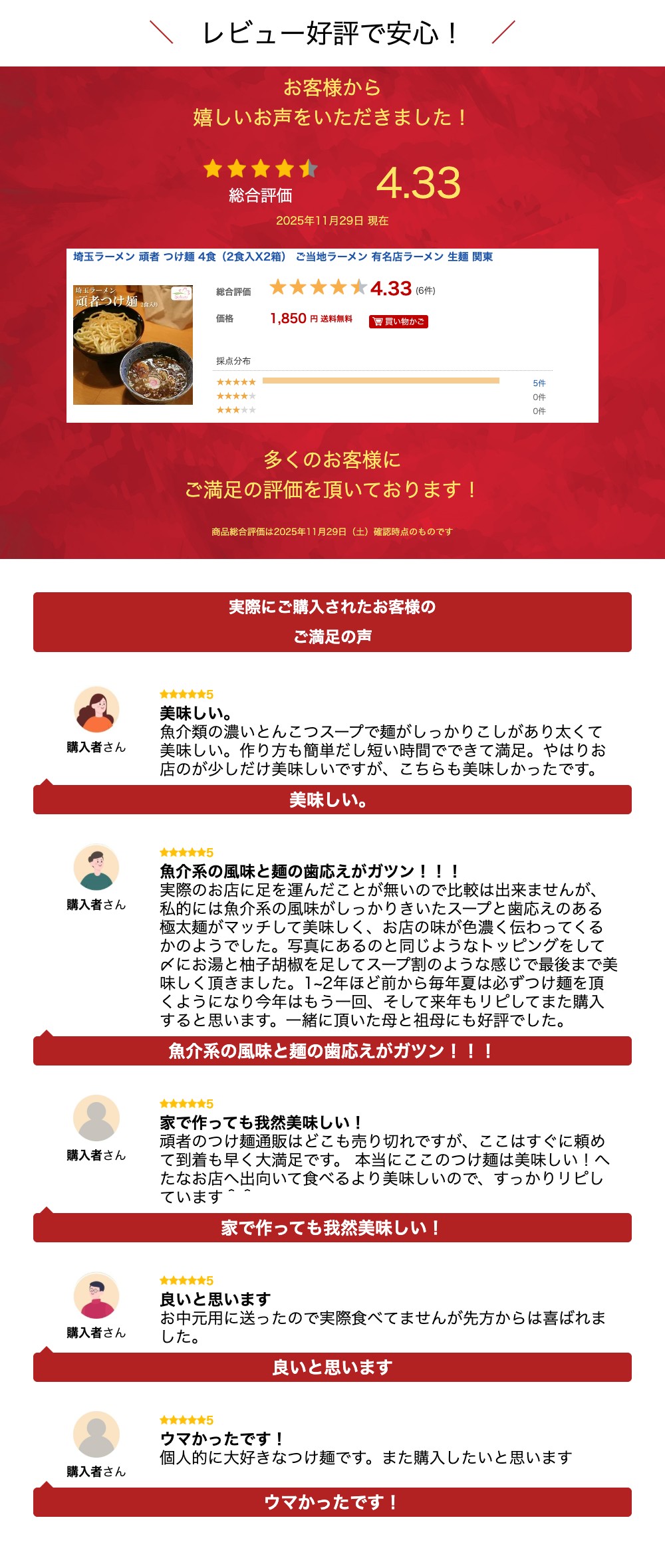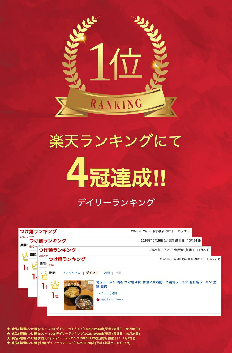麺のコシともっちり感。 肉系と魚系のうま味ダブルスープ。 濃厚なつけだれとコ極太麺の絡み合い。 郡を抜いたバランスの良さを多くの人が口にする。 古い街並が残る、埼玉川越に行列ができる。 まだかまだかとうかがう先には頑者の暖簾。 お客の八割はつけ麺が目当て。 日々の店主のこだわりが、この結果に現れている。 名 称 生ラーメン(埼玉つけ麺頑者)4食入り 原材料 【麺】小麦粉、小麦蛋白、還元水飴、食塩、澱粉、酒精、かんすい 【スープ】肉エキス、しょうゆ、動物油脂、食塩、魚介エキス、ポークブイヨン、砂糖、植物油脂、調味油脂、かつお節粉末、醸造酢、煮干し粉末、香辛料、調味料(アミノ酸等)、酒精、増粘剤(キサンタン)、酸化防止剤(ビタミンE)、酸味料、(原材料の一部に小麦、さば、大豆、鶏肉、豚肉、魚介類を含む) 内容量 【麺】140gX4(麺) 【スープ】48gX4(スープ) 【魚粉】1g×4 ■宅配便でお届け ■常温保存 ■賞味期限:製造日より90日 ■販売者:(有)頑者 KSF ※パッケージはメーカーの都合により、変更する場合がございます。 予め、ご了承下さいませ。 お土産・ギフト・プレゼント・お中元・お歳暮などに喜ばれる化粧箱入り ***************************** 【自然派ストアSakuraのご紹介】 ■豊富な商品の取り揃え自然派ストアSakuraではフリーズドライのスープやお味噌汁、レトルト惣菜、魚料理、肉料理、野菜料理、おかゆ、名店監修のご当地ラーメン、ご当地カレー、スイーツなど常温保存で便利な商品を中心に取り揃えており、百貨店やスーパーなど実店舗ではなかなか手に入りにくいものをインターネットで販売しております。当店オリジナルの組み合わせでの詰め合わせセットも多数ご用意しており、お惣菜のセット商品は種類が豊富で様々なおかずが入っているので嬉しいと好評いただいております。受け取り手をわくわくさせるギフトボックスセットもございますので、お祝い事やお返しの品にぴったりです。また健康志向として減塩や低糖質、食物繊維が豊富な食品など体に優しい商品の取り扱いもございます。 ■常温で保存期間も長く便利当店で扱う商品は基本常温保存が可能なため、商品到着後からお召し上がりいただくまでの置き場所に困らず、冷蔵庫や冷凍庫の空きを確保する必要がございません。また賞味期限も製造から1年、3年、5年など長期保存可能な商品もあり、保存食や非常用の備蓄としてもご利用いただいております。 ■お手軽調理で様々な場面で活躍基本的な調理は電子レンジや湯煎で温めるだけや、お湯をかけるだけと工程の少ない簡単調理。レトルト惣菜は袋のまま調理が可能ですので、温める前に容器に移す手間が省けます。そのため忙しい時の昼食、夕食の一品や、小腹が空いた時の夜食、常温保存が可能なためキャンプや登山などのアウトドアでの食事としてもおすすめです。また一人暮らしの家族や子育てで忙しい方への贈り物としてもおすすめです。 ■プレゼントとしも喜ばれています。常温保存で実用的な食品が多いので、母の日や父の日、敬老の日、御歳暮や御年賀、暑中見舞いなどの季節の贈り物としてはもちろん、お誕生日、御見舞、御祝い事やそのお返しの贈り物としも喜ばれています。プレゼント用には包装のご指定も承っております。ラーメン・うどんカテゴリーはこちら!関連商品埼玉ラーメン 頑者 つけ麺 2食入 ご当地ラーメン 生麺 関東...埼玉ラーメン頑者つけ麺 12食入り(2食入X6箱)ご当地ラーメン 生麺...925円4,083円京都ラーメン 天天有 4食(2食入X2箱)(とりの白濁スープ、ストレー...旭川ラーメン 青葉 4食セット(1箱2食入×2箱)(ちぢれ細麺 醤油ら...1,851円1,851円ご当地 つけ麺 濃厚極太 2種類12食セット 詰め合わせ 食べ比べ 千...つけ麺 千葉・松戸 中華蕎麦 とみ田 1箱2食入(極太麺 豚骨魚介つけ...5,400円920円ご当地 濃厚極太つけ麺 2店舗8食 セット(千葉 とみ田・埼玉 頑者)...東京ラーメン せたが屋 4食 (2食入X2箱) ご当地ラーメン 生麺...3,888円1,720円大阪 ブラックラーメン 金久右衛門 4食入(2食×2箱) ご当地ラーメ...東京ラーメン 麺屋 宗 4食入(2食×2箱) ご当地ラーメン 生麺 関...1,720円1,720円お店トップ>行列のできるラーメン店>■埼玉ラーメン頑者つけ麺 ラーメン・うどんカテゴリーはこちら!