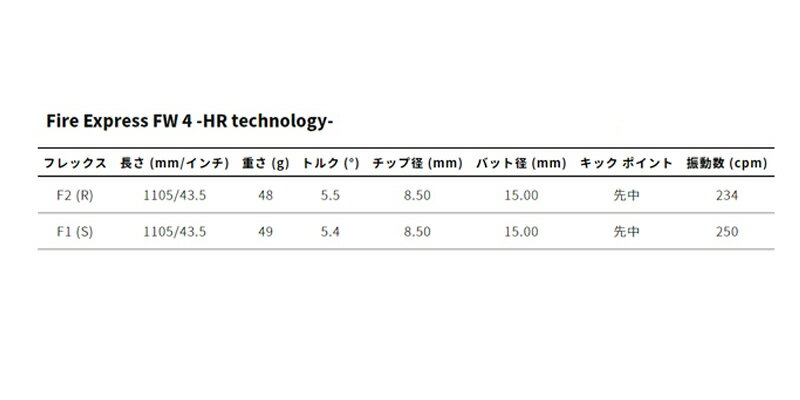 SRIXON スリクソン 2024 Zxi FW スリーブ付きシャフト コンポジットテクノ Fire Express FW 4-HR商品詳細スピード感と安定性を両立!Fire Express FW 4-HRの革新性能 コンポジットテクノの「Fire Express FW 4-HR」は、最新の高速ドライバーシャフトと相性抜群のフェアウェイウッド専用シャフト。飛距離性能とミート率の向上を両立し、スピード感のある鋭いフィーリングを提供します。 【特長1:高弾性・高強度素材で飛距離アップ】 TORAYCA® T1100Gを採用:超高弾性カーボンがしなり戻りを最適化し、ボール初速を向上。 六軸組布シート:手元と先端に配置し、剛性を高めながらスムーズな振り抜きを実現。 軽量化&高剛性:40g台の軽量設計ながら剛性を向上させ、振りやすさと安定感を両立。 【特長2:安定したインパクトを生むパワーチップ構造】 チップ側にタングステンパウダーシートを装着し、トゥダウンやヘッドの開閉を抑制。しなりを適切にコントロールすることで、ミート率が向上し、当たり負けしない安定したショットをサポートします。 【特長3:高級感あるプレミアムデザイン】 手元はクリアー、中間部はシルバー、先端はクロクリアー のグラデーション配色。 六軸組布シートが見える独自のデザイン で、他にはない存在感を演出。 Fire Expressシリーズ初のマット仕上げ により、プレミアム感を強調。 【こんなゴルファーにおすすめ】 高速ドライバーシャフトとの相性を重視する方 ミート率を向上させ、安定したショットを求める方 軽量シャフトで振りやすさを求める方 しなりを活かしながらも当たり負けしない剛性を求める方 最新素材と革新技術を融合した「Fire Express FW 4-HR」で、フェアウェイウッドの飛距離と安定感を手に入れよう! <スペック> F2(R) 長さ: 43.5インチ 重さ: 48g トルク: 5.5° チップ/バット: 8.50mm / 15.00mm キックポイント: 先中 振動数: 234cpm F1(S) 長さ: 43.5インチ 重さ: 49g トルク: 5.4° チップ/バット: 8.50mm / 15.00mm キックポイント: 先中 振動数: 250cpm <ポイント> Fire Express FW 4-HR ファイアーエクスプレス FWシャフト フェアウェイウッド用シャフト 軽量 TORAYCA T1100G 高弾性シャフト 六軸組布シート シャフト パワーチップ構造 FWシャフト 振りやすい シャフト 軽量 安定性の高い シャフト FW 高剛性シャフト ゴルフ スピード感のあるシャフト 40g台 FWシャフト 飛距離アップ シャフト FW ミート率向上 シャフト トゥダウン防止 シャフト マット仕上げ プレミアムシャフト ※在庫について当サイトに掲載されている在庫は店頭在庫と連動しております。必ずしもリアルタイムの在庫状況ではございません。在庫がなかった場合は、メールにてお知らせいたします。メーカー取り寄せ品、生産終了、在庫終了等の際、ご注文をキャンセルさせていただく場合がございます。予めご了承くださいませ。付属の固定ネジに関して当店では、スリーブの先端にヘッドを固定するネジを予備でお付けしております。必ず取り外してから装着してください。尚、この付属品は、サービスの一環として提供させていただいております。※ヘッドモデルによってはネジ仕様に違いがあり固定できない場合がございます。あらかじめご了承ください。ご購入にあたっての注意事項(必ずご確認下さいませ)弊店ではすべてのお客様に安定した品質をご提供するため、信頼されるサービスを提供いたします。長さ当店の長さ測定基準は60°法を用いて選択いただいたヘッドを装着した状態で、シャフトエンドまでとなります。お持ちのクラブと当店の長さ測定基準の図解を併せてご確認いただき、ご指定ください。なお、シャフト単体やスリーブ先端からグリップエンドまでの測定は行っておりません。シャフト・構えた時に見えないよう、シャフトロゴの向きは「下向き」に組み上げております。別途指定がある場合は、備考欄に記載下さい。・選択いただいた装着ポジションにおいて「シャフトロゴは裏側(構えた時見えない)」を基準としております。・バランス調整、振動数の計測は行っておりません。スリーブ・スリーブは非純正品となりますが、問題なくご使用いただけます。・スリーブの先端には、ヘッドを固定するネジを予備でお付けしております。取り外してから装着して下さい。尚、この付属品は、サービスの一環として提供しております。ヘッドモデルによってはネジ仕様に違いがあり装着出来ない場合がございます。グリップ・標準装着のゴルフプライド、IOMIC、タッキーマークとの差額値引きは行っておりません。・標準で装着しているIOMICとタッキーマークグリップは、「グリップロゴ裏刺し(構えたときに見えない)」を基準としています。・グリップの変更を希望される場合は、デフォルト設定から『変更する』を選択し、別途販売ページでグリップ単体を購入してください。備考欄への記載はご遠慮ください。・グリップ変更でバックライン有のグリップ、またはバックライン無のグリップは、次の基準で統一しております:バックライン有:グ