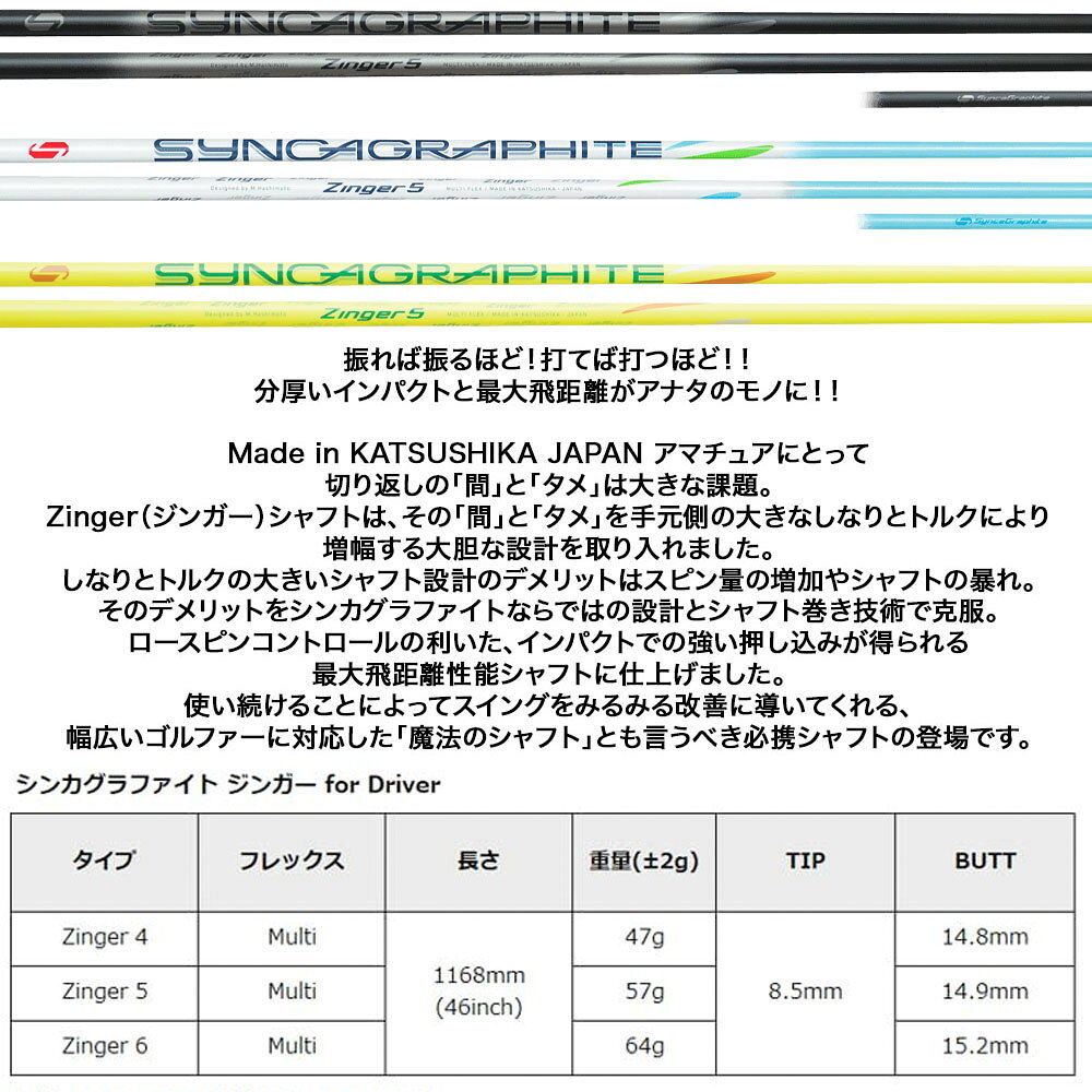 SRIXON スリクソン 2024 Zxi スリーブ付シャフト シンカグラファイト Zinger ジンガー 4・5・6 飛距離アップ ロースピン系シャフト商品詳細飛距離を追求するすべてのゴルファーに捧げる、Syncagraphite(シンカグラファイト)のZinger(ジンガー)シャフト。アマチュアゴルファーが苦手とする「切り返しの間」や「タメ」をシャフト設計によってサポートするという革新的な発想から誕生したZingerは、しなりとトルクを大きく取りながらも、シンカグラファイトの精密な巻き技術によってスピンを抑え、安定した弾道と最大飛距離を実現します。 「Zinger 4」は、飛距離をとにかく伸ばしたい・取り戻したいゴルファーに。「Zinger 5」はスイング改善と押しのある打感を求めるプレイヤーにおすすめ。「Zinger 6」はハードヒッターに最適で、振れば振るほど厚いインパクトが手に入ります。 スイングを続けるうちに自然と改善へ導く「魔法のシャフト」とも言えるZinger。ロースピンかつ球をしっかり押し込める構造で、方向性・飛距離・操作性すべてを高次元で融合。Made in KATSUSHIKA JAPANの高品質な仕上がりと、日本人ゴルファーの感覚にマッチしたしなり設計が、初心者から上級者まで幅広く対応します。 <スペック> Type Flex Weight(g) ジンガー4 マルチ 47 ジンガー5 マルチ 57 ジンガー6 マルチ 64 Made in KATSUSHIKA JAPAN <ポイント> シンカグラファイト Syncagraphite Zinger ジンガー Zinger4 Zinger5 Zinger6 ゴルフシャフト 飛距離アップ シャフト しなり系シャフト 張り感 シャフト 強弾道 シャフト ロースピン シャフト ゴルフスイング 改善 ドライバーシャフト 高初速 シャフト 軽量シャフト 切り返し タメ シャフト 飛ばせる ハードヒッター向け スイング改善 シャフト 初心者 シャフト 選び方 上級者 シャフト 評判 マルチフレックス設計 可変フレックス 高適応性シャフト スイング追従性 しなやかな挙動 自在なしなり 高初速対応 フィーリング重視 安定感と操作性 弾きの鋭さ トルク感としなり戻り 自分に合う挙動 スイングに合わせて変化 ※在庫について当サイトに掲載されている在庫は店頭在庫と連動しております。必ずしもリアルタイムの在庫状況ではございません。在庫がなかった場合は、メールにてお知らせいたします。メーカー取り寄せ品、生産終了、在庫終了等の際、ご注文をキャンセルさせていただく場合がございます。予めご了承くださいませ。付属の固定ネジに関して当店では、スリーブの先端にヘッドを固定するネジを予備でお付けしております。必ず取り外してから装着してください。尚、この付属品は、サービスの一環として提供させていただいております。※ヘッドモデルによってはネジ仕様に違いがあり固定できない場合がございます。あらかじめご了承ください。ご購入にあたっての注意事項(必ずご確認下さいませ)弊店ではすべてのお客様に安定した品質をご提供するため、信頼されるサービスを提供いたします。長さ当店の長さ測定基準は60°法を用いて選択いただいたヘッドを装着した状態で、シャフトエンドまでとなります。お持ちのクラブと当店の長さ測定基準の図解を併せてご確認いただき、ご指定ください。なお、シャフト単体やスリーブ先端からグリップエンドまでの測定は行っておりません。シャフト・構えた時に見えないよう、シャフトロゴの向きは「下向き」に組み上げております。別途指定がある場合は、備考欄に記載下さい。・選択いただいた装着ポジションにおいて「シャフトロゴは裏側(構えた時見えない)」を基準としております。・バランス調整、振動数の計測は行っておりません。スリーブ・スリーブは非純正品となりますが、問題なくご使用いただけます。・スリーブの先端には、ヘッドを固定するネジを予備でお付けしております。取り外してから装着して下さい。尚、この付属品は、サービスの一環として提供しております。ヘッドモデルによってはネジ仕様に違いがあり装着出来ない場合がございます。グリップ・標準装着のゴルフプライド、IOMIC、タッキーマークとの差額値引きは行っておりません。・標準で装着しているIOMICとタッキーマークグリップは、「グリップロゴ裏刺し(構えたときに見えない)」を基準としています。・グリップの変更を希望される場合は、デフォルト設定から『変更する』を選択し、別途販売ページでグリップ単体を購入してください。備考欄への記載はご遠慮ください。・グリップ変更でバックライン有のグリップ、またはバックライン無のグリップは、次の基準で統一しております:バックライン有:グリップロゴ表バックライン無:グリップロゴ裏※別途ご希望がある場合は、備考欄にご記載ください。・グリップ変更でバックライン有を希望された場合、グリップロゴの位置がヘッドの個体差によりフェースが被って見えるまたは、開いて見える場合がございます。ご理解の上、ご注文ください。・グリップ下巻きに関しまして下巻 割増 110円https://item.rakuten.co.jp/ba