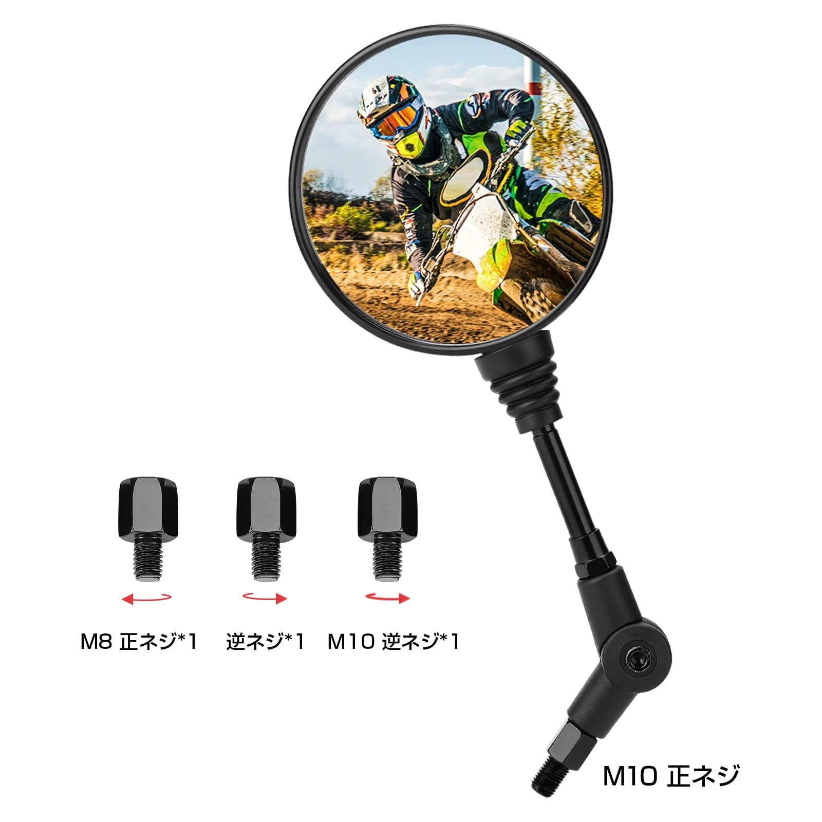 商品情報商品の説明主な仕様 【視界性抜群】ミラーで一番大切な事は視認性です。当該ミラーの直径は115mmなので、他のミラーより鏡面が大きく微量な凸状になっているため、見やすくなります。また、走行中のガタ付きも少ないです。【ご注意】バイクミラーにある「L」は認証マークであり、左右のことではないです。br【広い調整範囲】広い角度が調整でき、可動域は十分なので、自分の一番見易い所にミラーを持ってくることが可能です。br【折りたたみ機構】個別のミラーは横に張り出しており、面積は広めながら若干低いです。また、近めでもあって、視線移動量は大きめです。そしてすり抜けには邪魔することがあります。壁に寄せたり、狭い駐輪場では折り畳み機構が便利です。可倒性は、しっかりボルトを締めておけば走行中にダラんと倒れてくることはありません。ご注意:定期的な増し締めで、振動によるミラーブレを回避されます。br【オフ車に対応可能】可倒式オフロードミラーの角度が調節できますし、走り出す時に振動が大きいオフ車にも、ミラーブレは少ないので、林道用またはトレール車でオフロード走行する人にお勧めします。br【コスパ良い】材質はステンレス・ABS樹脂で、耐衝撃性、遮音性、耐傷性、耐熱性に優れています。車検に通る円形ミラーのサイズは鏡面のサイズが直径94mm以上150mm以下で、面積が69平方センチメートル以上である。当該ミラーの直径115mm、面積が103平方センチメートで車検/安全基準に対応されます。