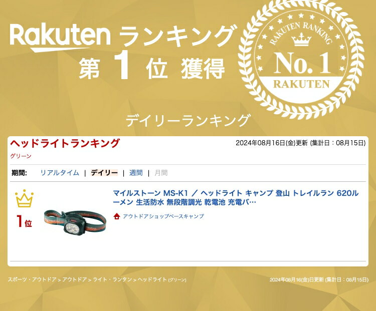 マイルストーン MS-K1 / ヘッドライト キャンプ 登山 トレイルラン 620ルーメン 生活防水 無段階調光 乾電池 充電バッテリー ハイブリッド
