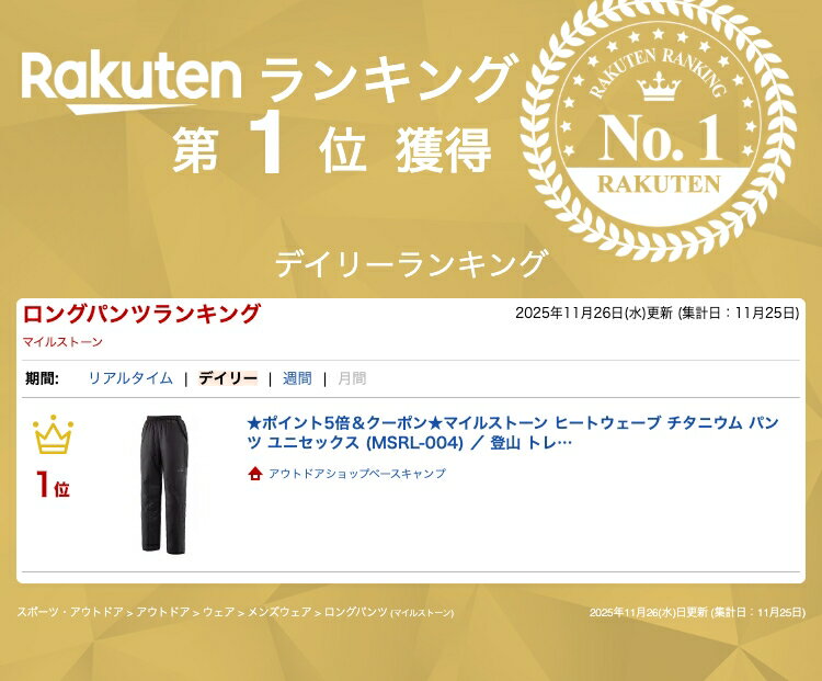 マイルストーン ヒートウェーブ チタニウム パンツ ユニセックス (MSRL-004) / 登山 トレラン インサレーション 化繊 保温着 パッカブル コンパクト収納